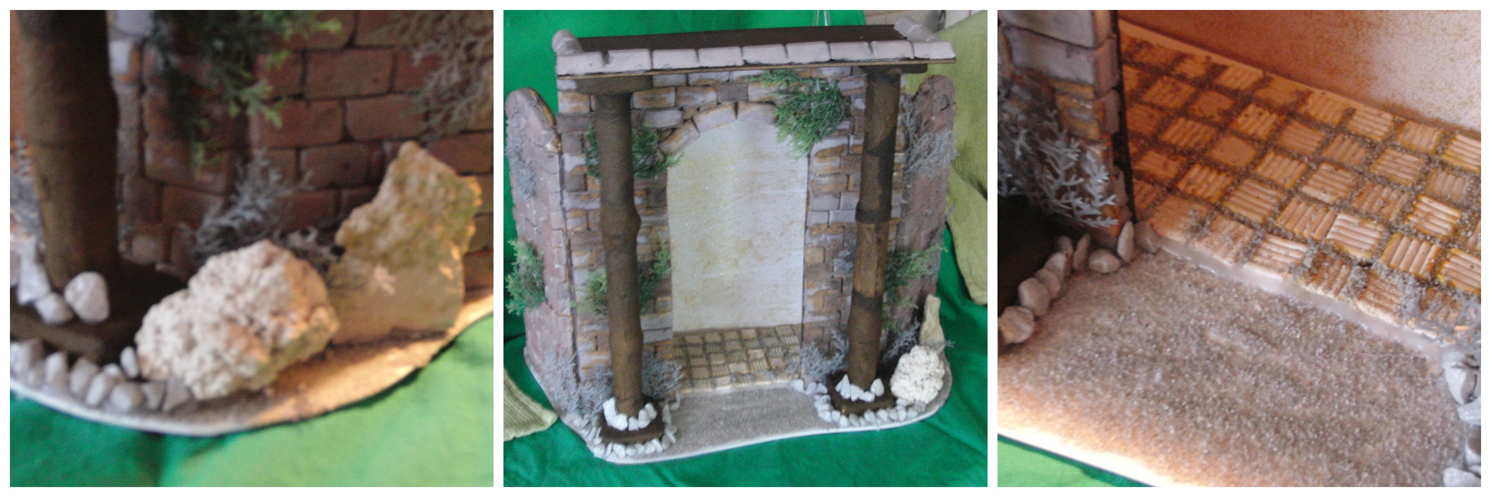 Von meiner TO-DO Liste habe ich ihn ja schon gestrichen, nun kommt das fertige Ergebniss. Meine verwendeten Materialien: Spanplatten, Gips, Sand, Dekosand, Wasser, Holzleim, Heißklebepistole, Holzbeize, Steine, Dekosteinchen, künstliches Gras, PVC Platten, Mosaiksteinchen für den Boden im Tempel – abgeformt und aus Gips gegossen. Rundholz und Küchenpapier für die Säulen. Hier weitere Impressionen: Hier habe ich eine vorgefertigte Giessplatte benutzt, sowie eine „Schablone“ erstellt mit Hilfe von Flüssigsilikon und einigen gekauften Mosaiksteinen. Diese habe ich als Boden im Tempel verwendet. Den Rest für die Mauern. Den Gips habe ich vor dem Giessen mit Wandfarbe gemischt – daher die braunen Steine – man verwendet einfach das was man im Haus hat 🙂