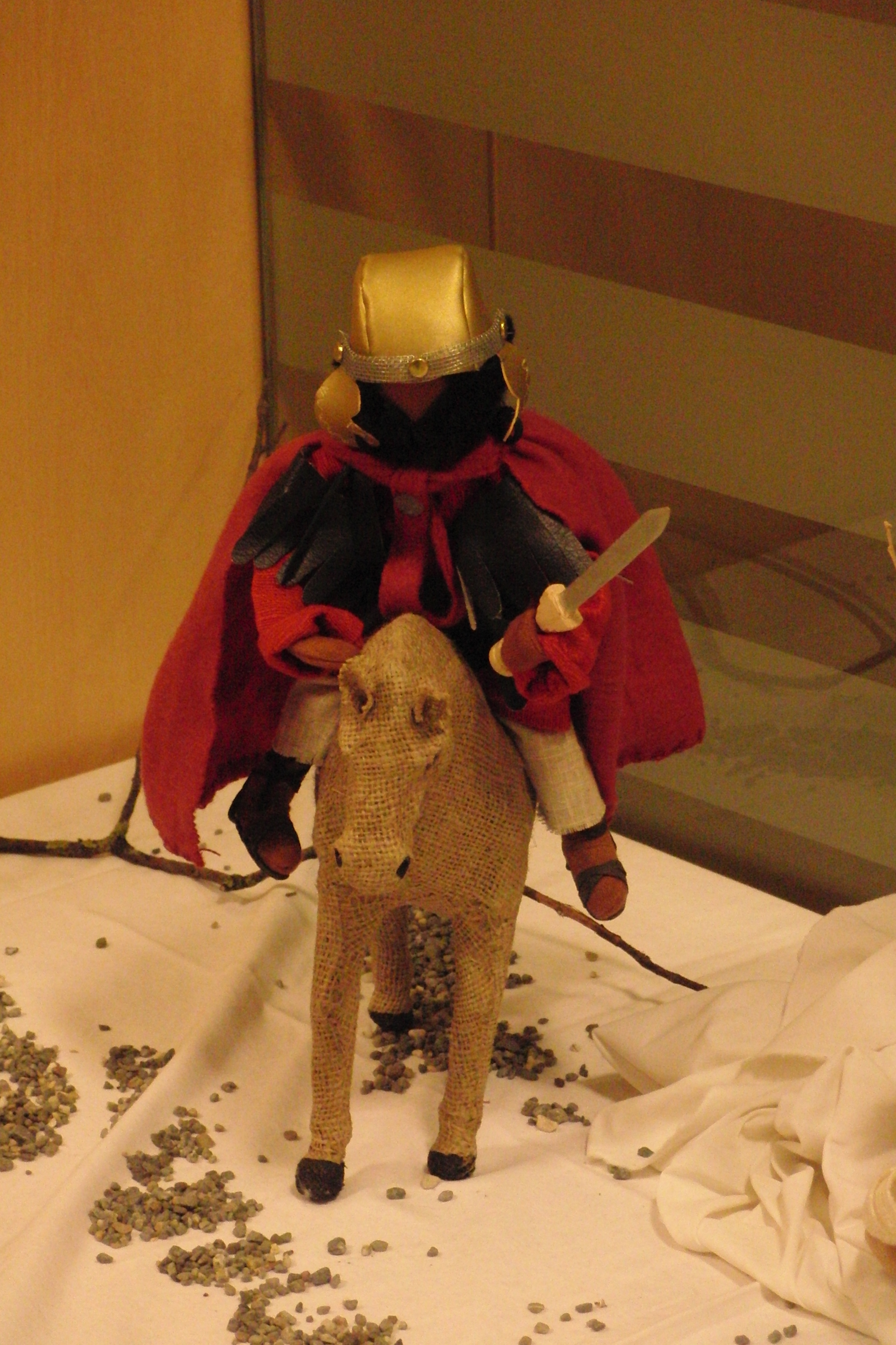 Er reitet auf einem Pferd. Es schneit. Martin trägt einen Helm und ein Schwert.