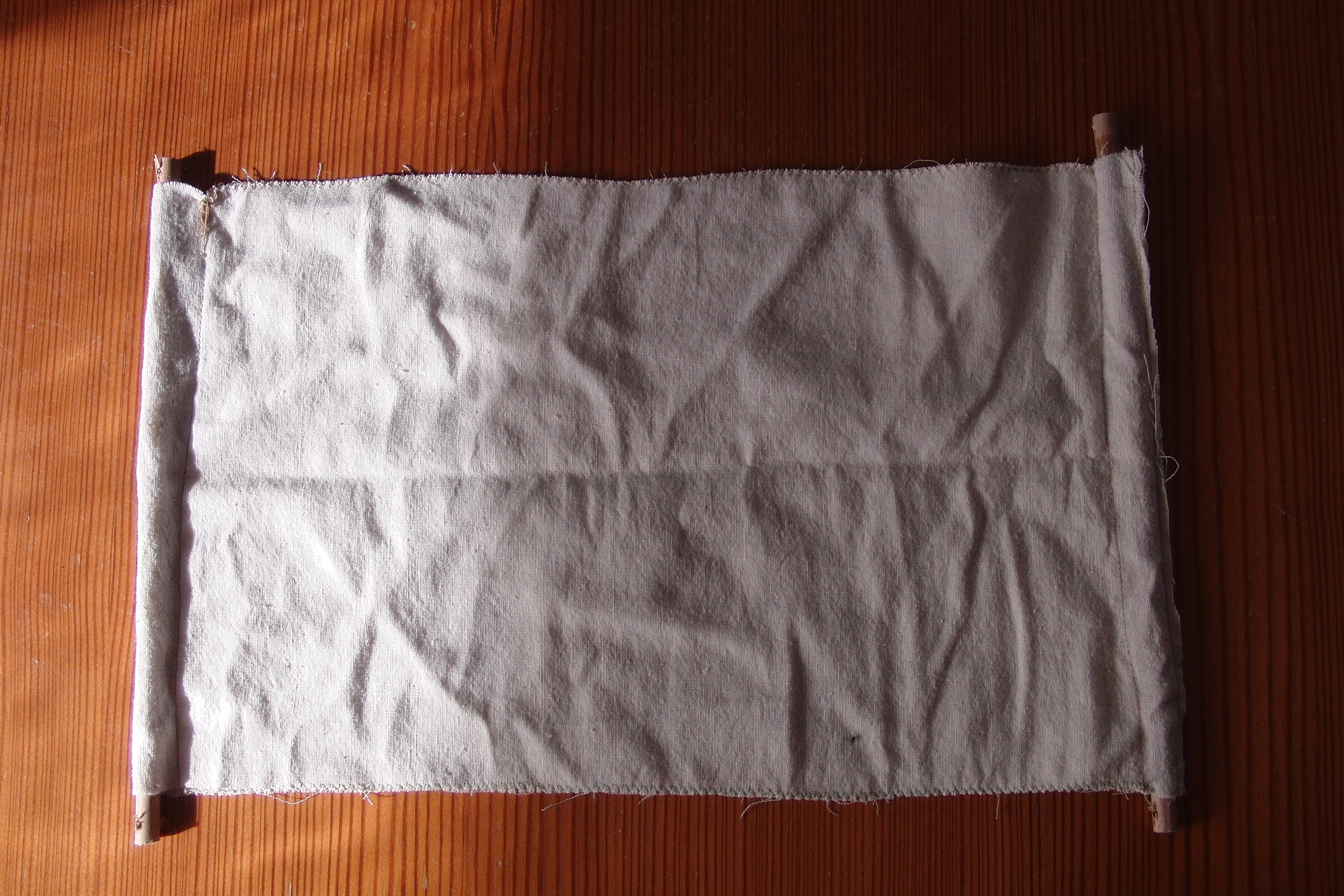 Aus einer alten Stoff-Einkaufstasche habe ich das Segel zugeschnitten und rundherum abgenäht. Dazu hab ich auf beiden Seiten (unten und oben) je einen Tunnel eingenäht um die Querbalken einzuziehen.