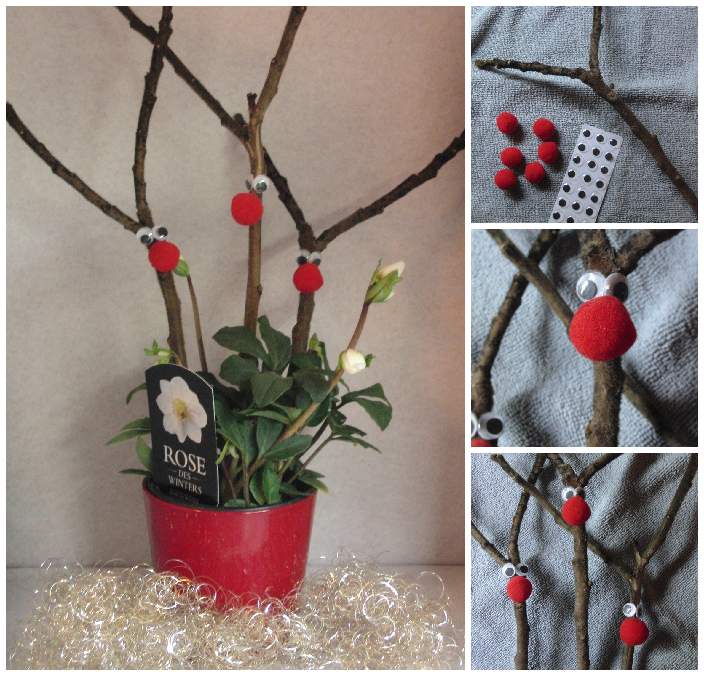 Material: Äste mit Gabelung, rote Pompons, Wackelaugen, Heißklebepistole