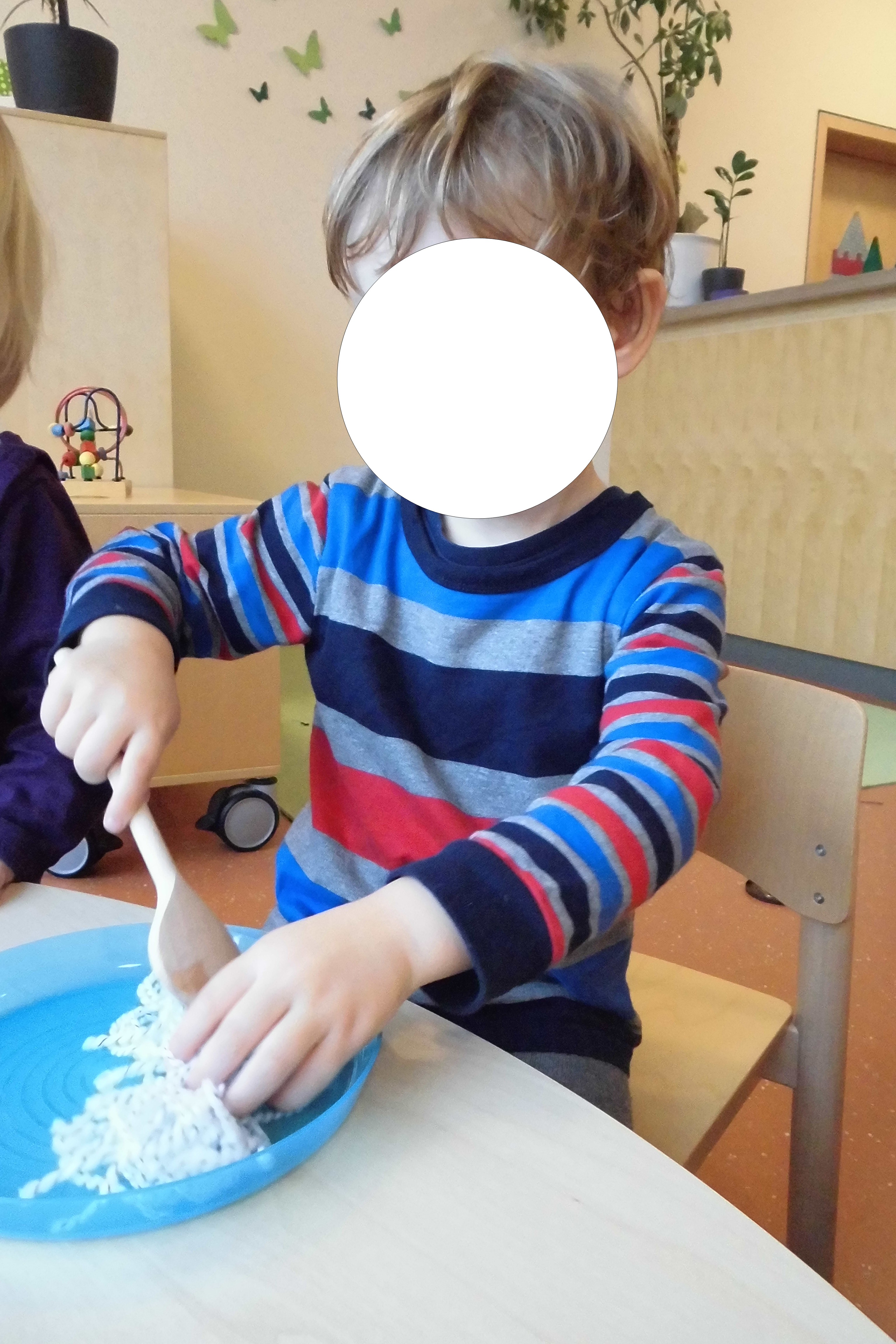 Unsere Kinder im Krippenbereich lieben es zu „kochen“. Nicht nur richtig, sondern auch im Spiel. Neulich erst hat eins unserer Mädels Spaghetti im leeren Topf gekocht. Das geht doch nicht dachte ich mir, also habe ich aus der Wollkiste ein dickes Kneul geholt und hab Spaghettinudeln geschnitten.