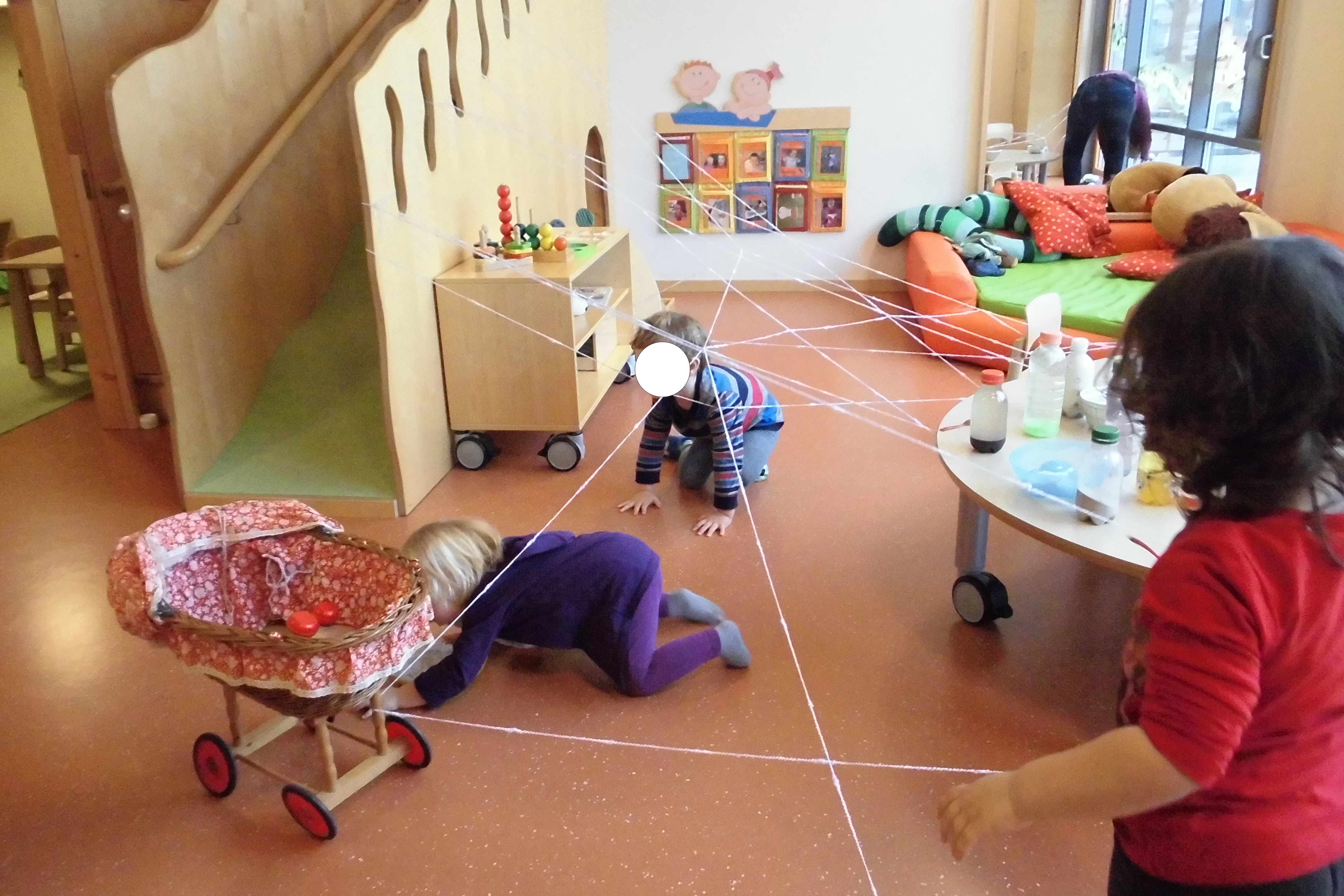 Ich hab um sie herum ein Spinnenetz gebunden – erst haben sie geschaut was ich mache, schon bald sind sie drunter und drübergeklettert. Die großen fanden es richtig witzig – ein kleiner hat mächtig geschumpfen weil ich den Puppenwagen miteingebunden hatte. *lach*