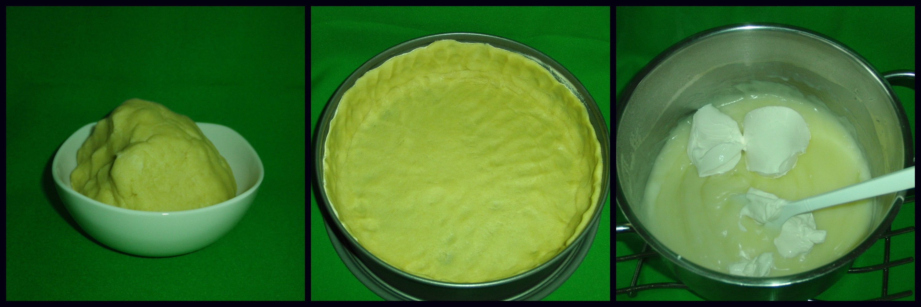 1. Mürbteig herstellen, Springform(28er) einfetten, damit auslegen, dabei einen hohen Rand formen.