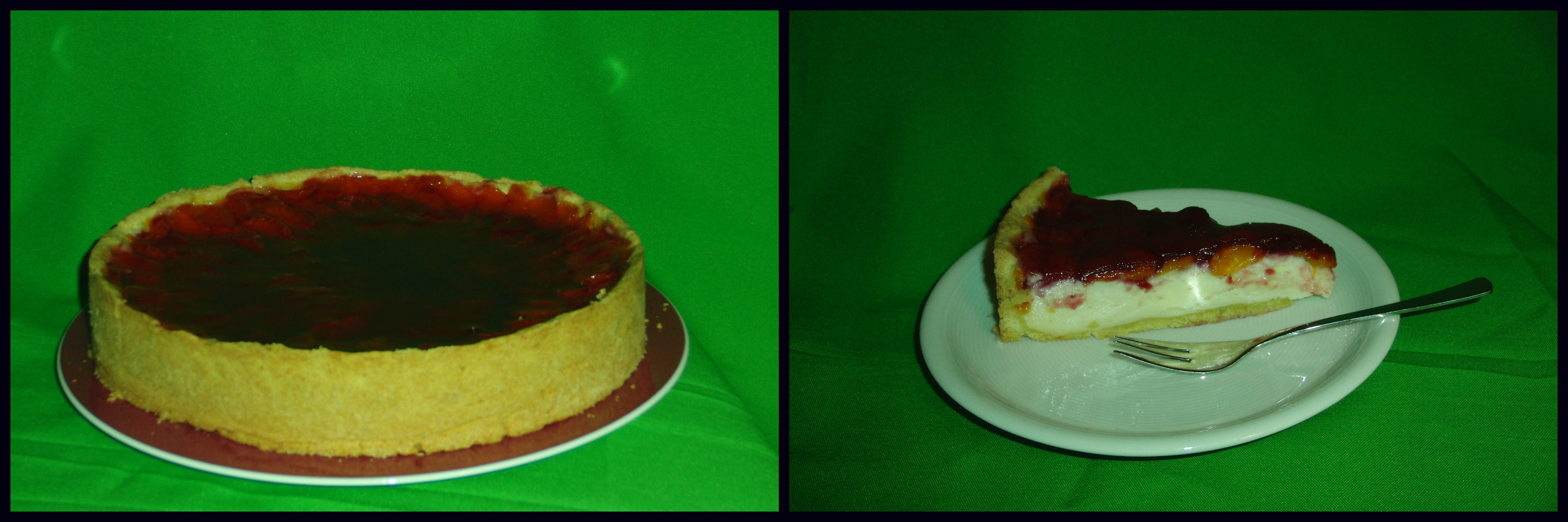 Belag: 3 Dosen Mandarinenorangen 1Pkg roter Tortenguß-> anstelle des Wassers 250ml Saft von Sauerkirschen (Glas)