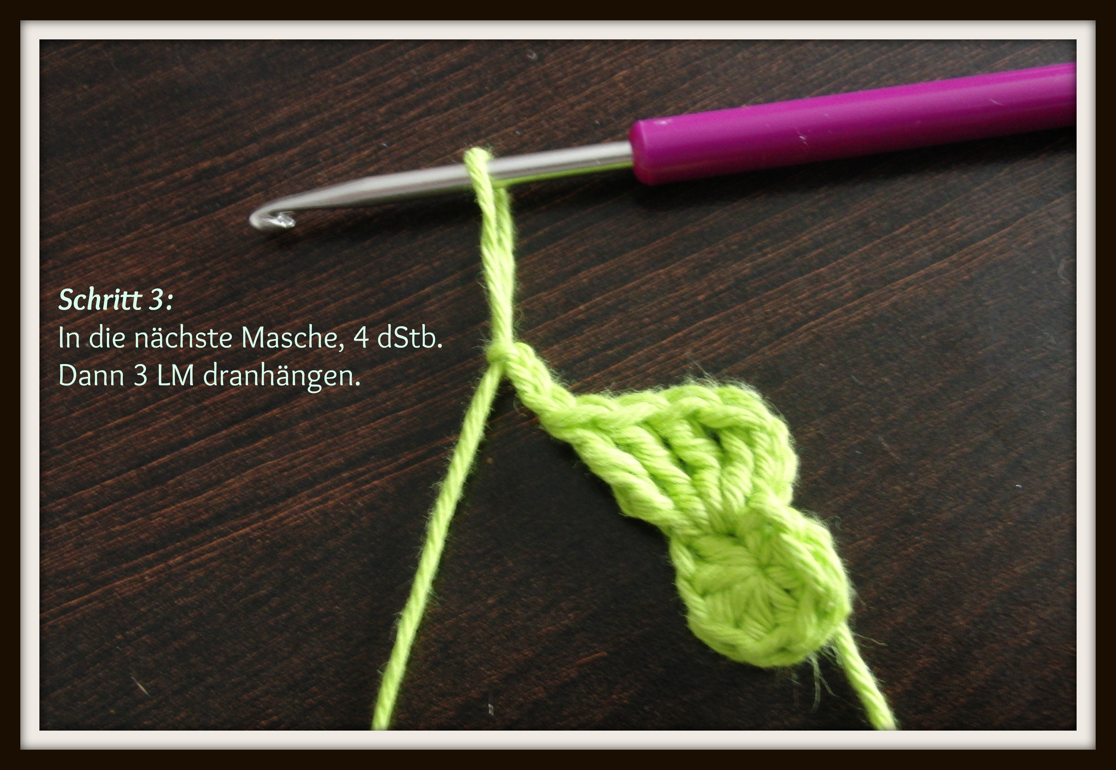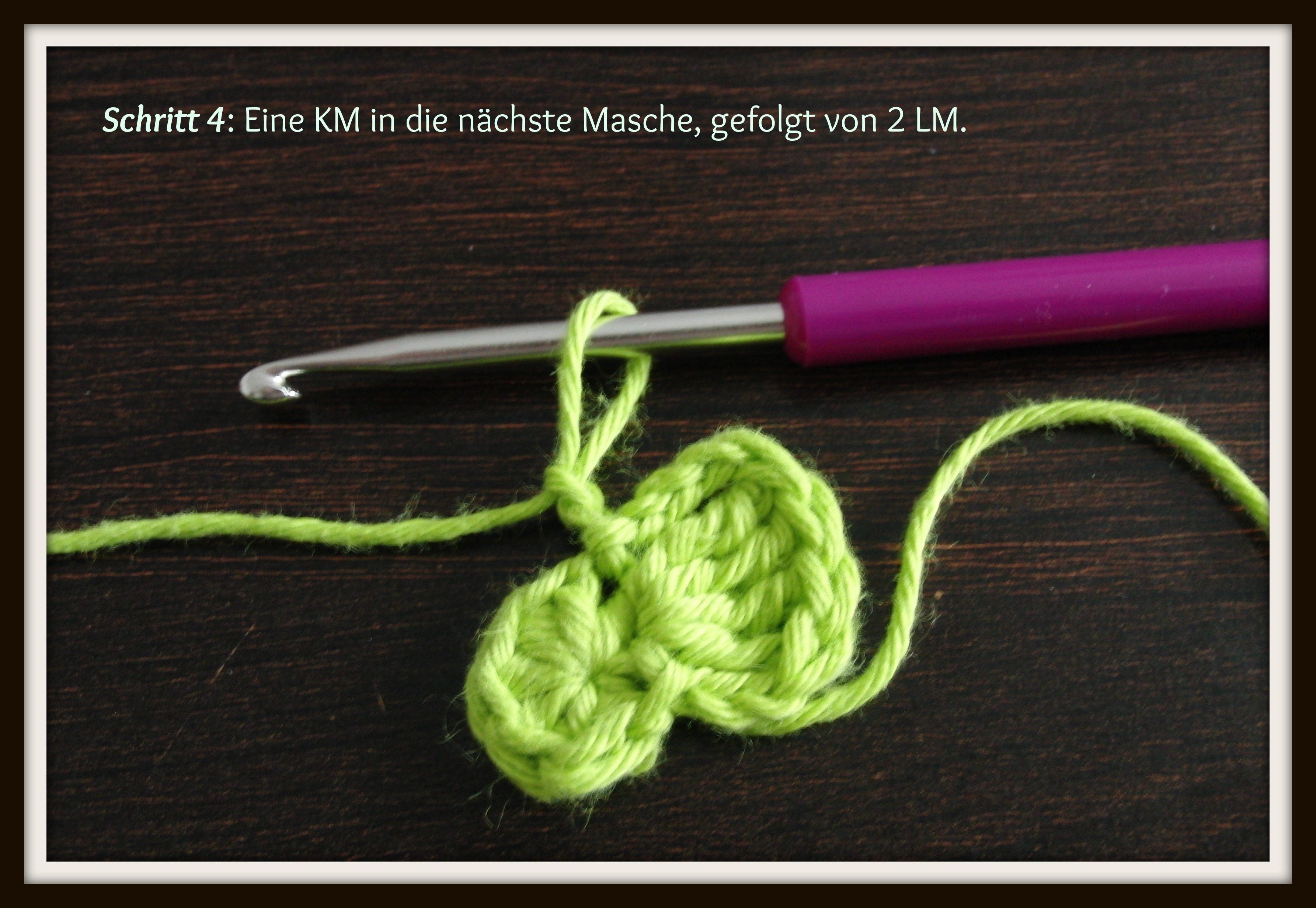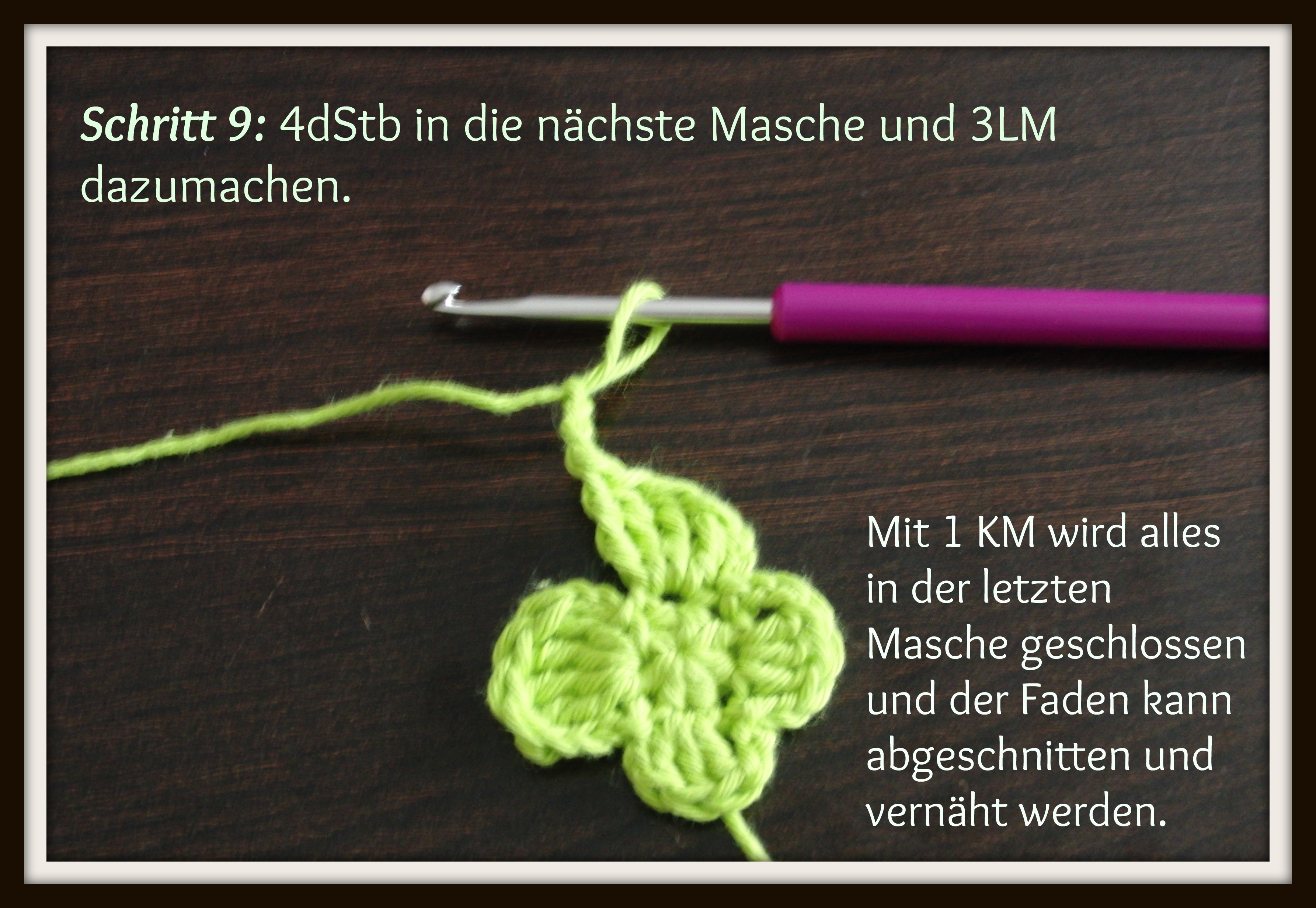 Benutzte Maschen: KM=Kettmasche, LM= Luftmasche. Stb= Stäbchen, dStb= Doppelstäbchen.