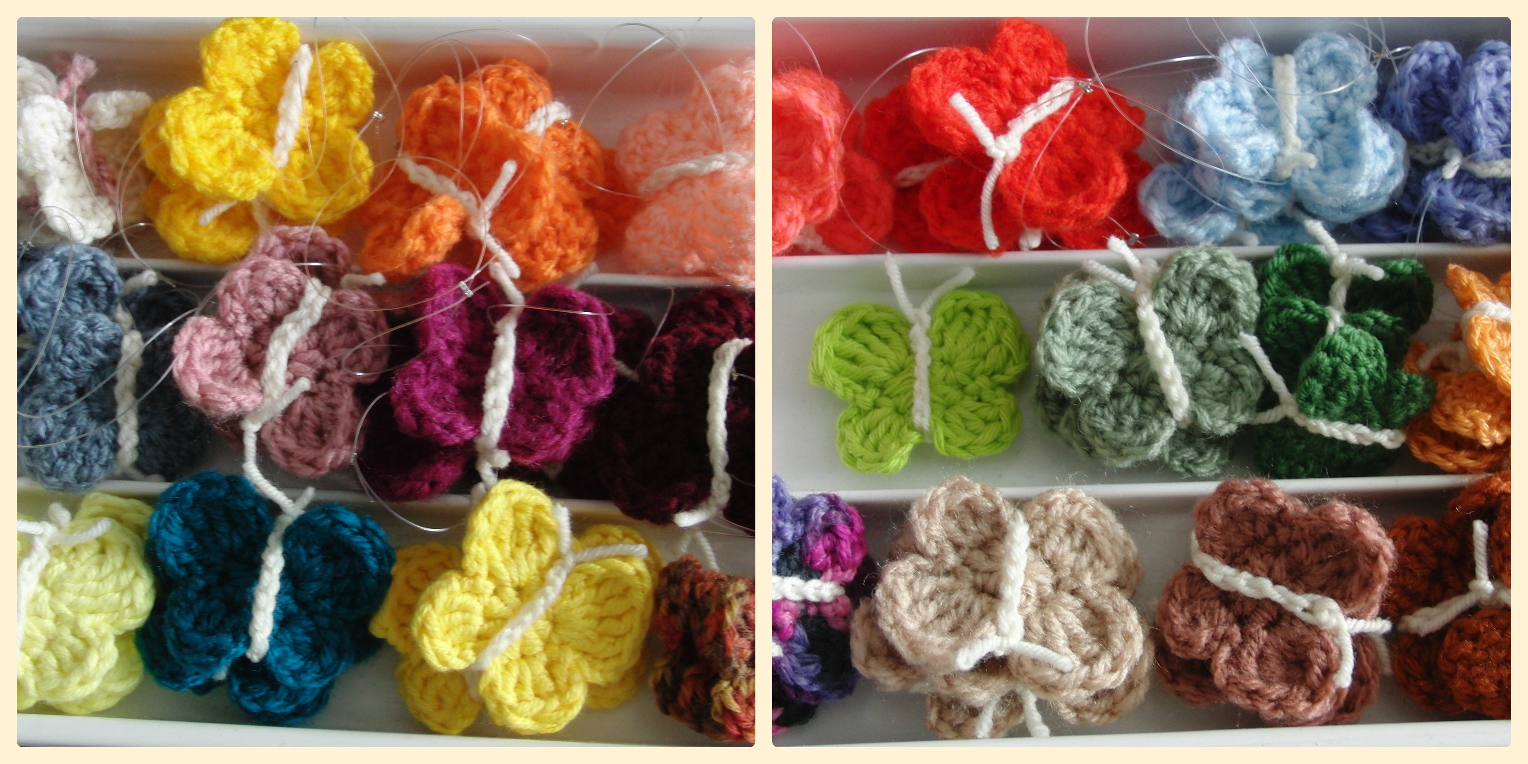 24 Ketten á 3 Schmetterlinge sind schon fertig. Wieviele Schmetterlinge das schon sind dürft ihr ausrechnen, denn ich hab noch ein paar Farben vor mir 🙂
