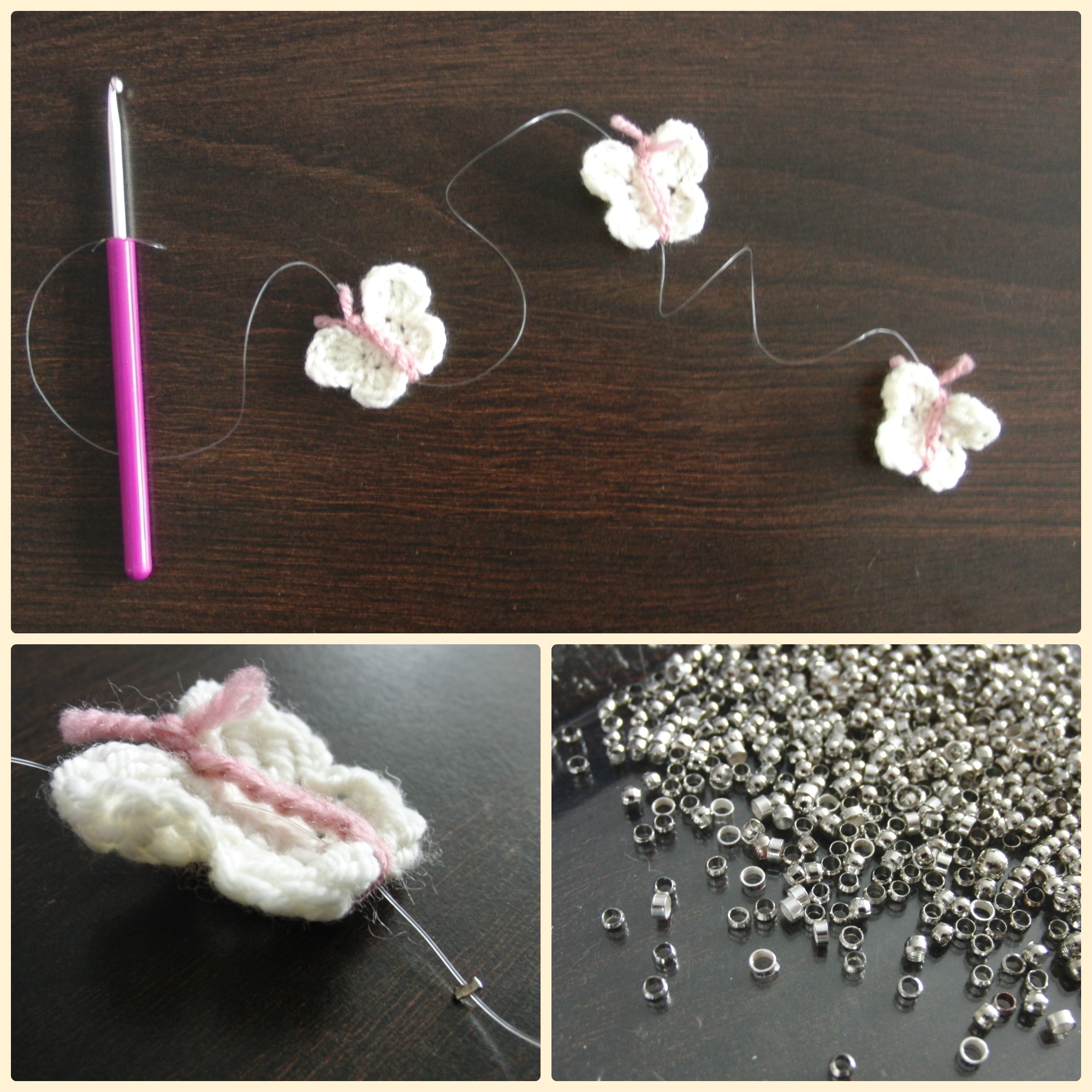 Material: Nylonschnur (dünn), Quetschperlen (Schmuckbedarf) und die Schmetterlinge