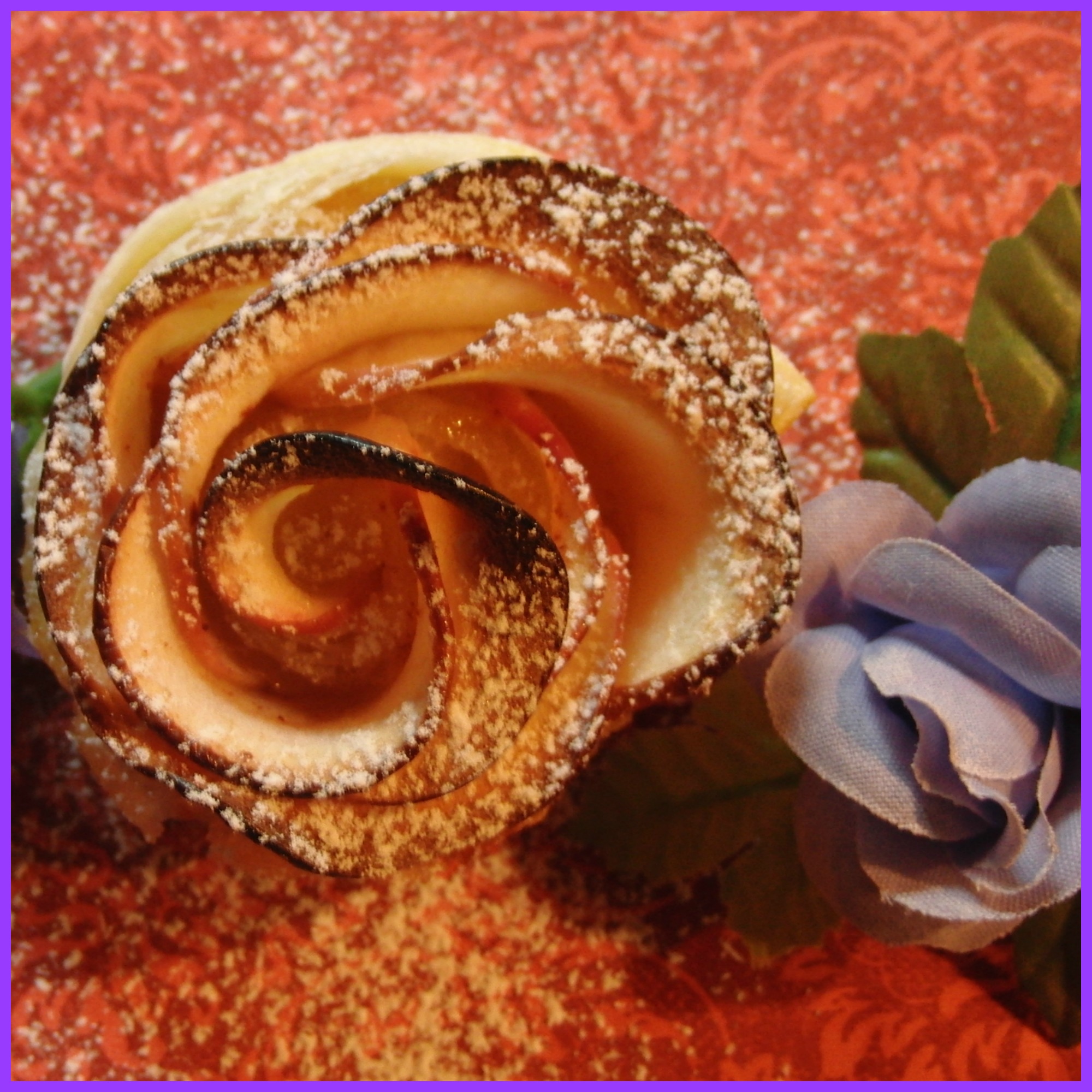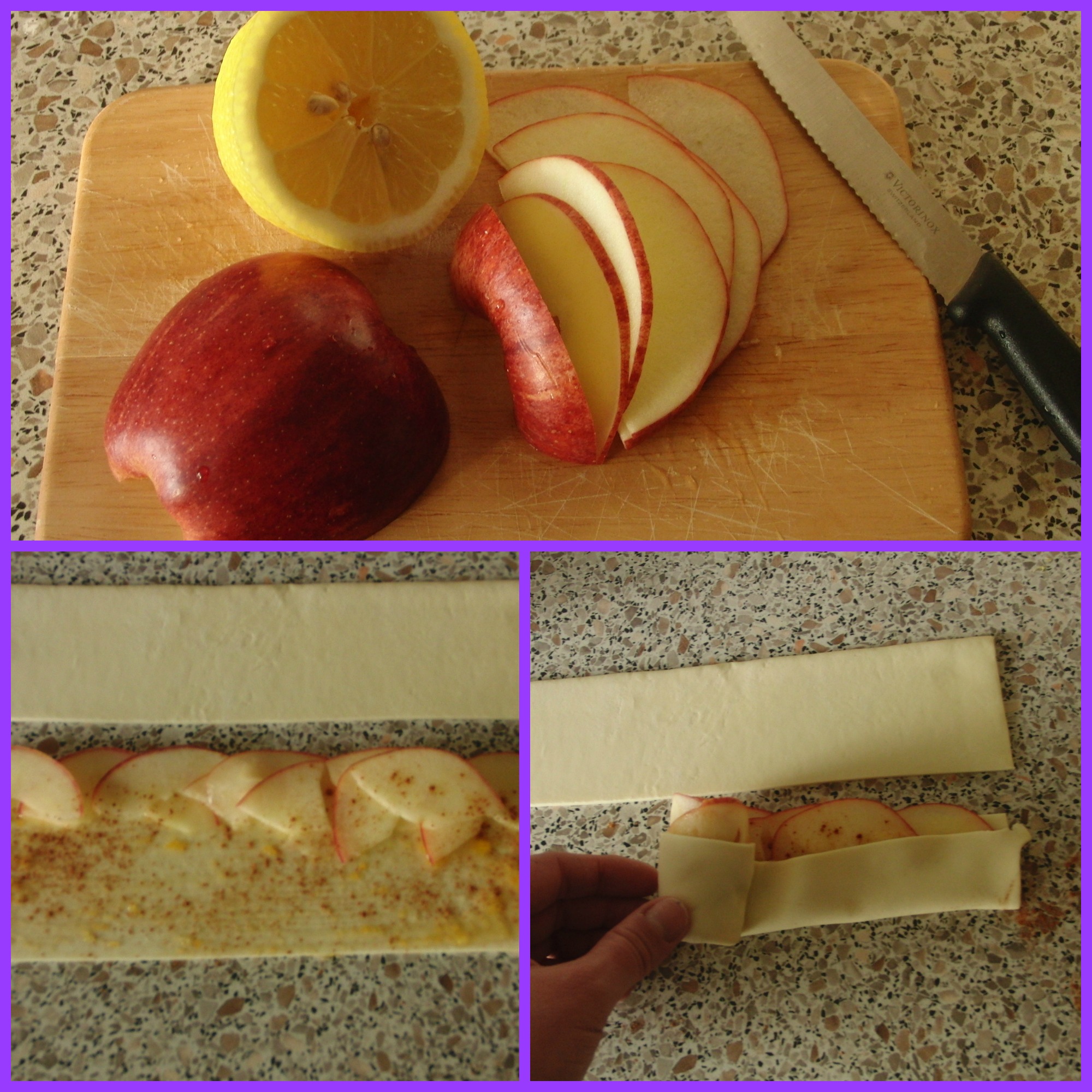 Die Äpfel werden halbiert und vorsichtig entkernt. Dann werden dünne Scheiben geschnitten ( wenn ihr einen Hobel habt 🙂 um so besser). Sind die Scheiben zu dick, brechen sie durch beim Einrollen der Blume. 😦