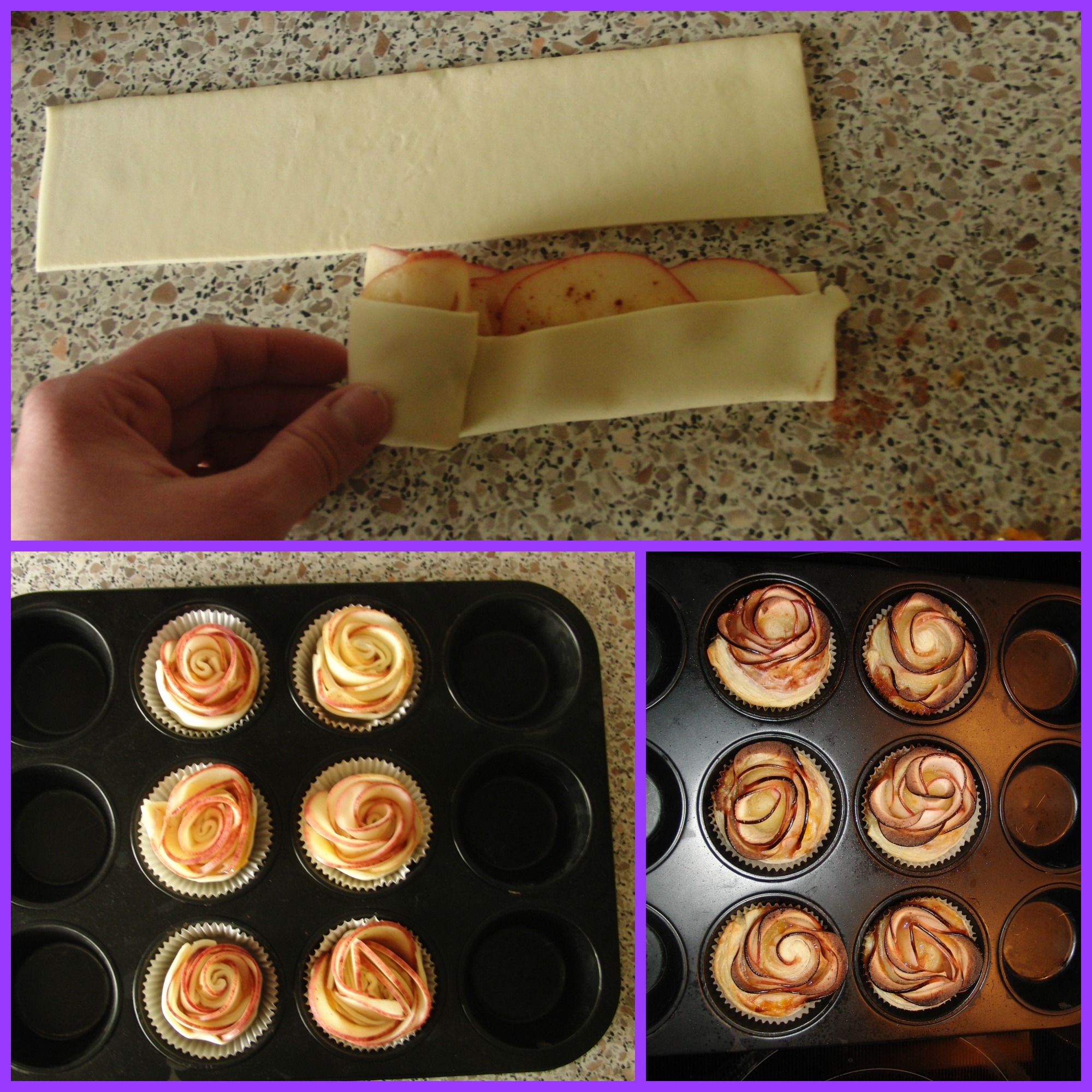Beim ersten Mal habe ich sie in Muffinpapierförmchen reingetan, beim zweiten mal in die eingefettete Muffinform. Beide Male waren sie etwas festgebacken. Hmmm… Da die Apfelränder etwas dunkel werden, hab ich etwas von der Aprikosenmarmelade noch auf die fertigen Rosen draufgemacht.