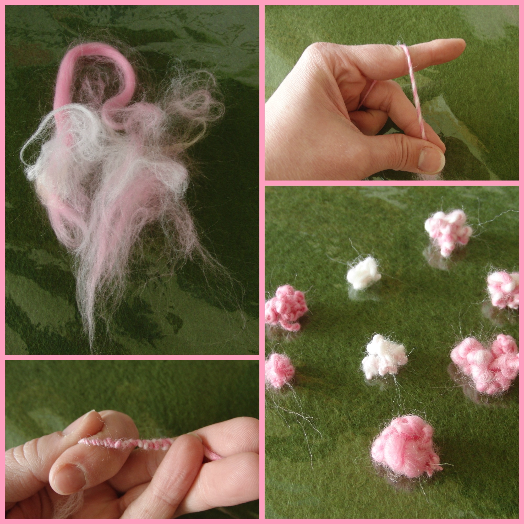 Das Prinzip ist simpel. Einfach dünne Stränge der Wolle wie eine Kordel zwischen den Fingern eindrehen. Irgendwann kräuseln sie sich ein und dann nur noch die Enden verknoten. Diese sieht man nichtmehr wenn man die Enden einfach in die Mitte steckt. Die Blumen kann man dann für andere Projekte noch benutzen.