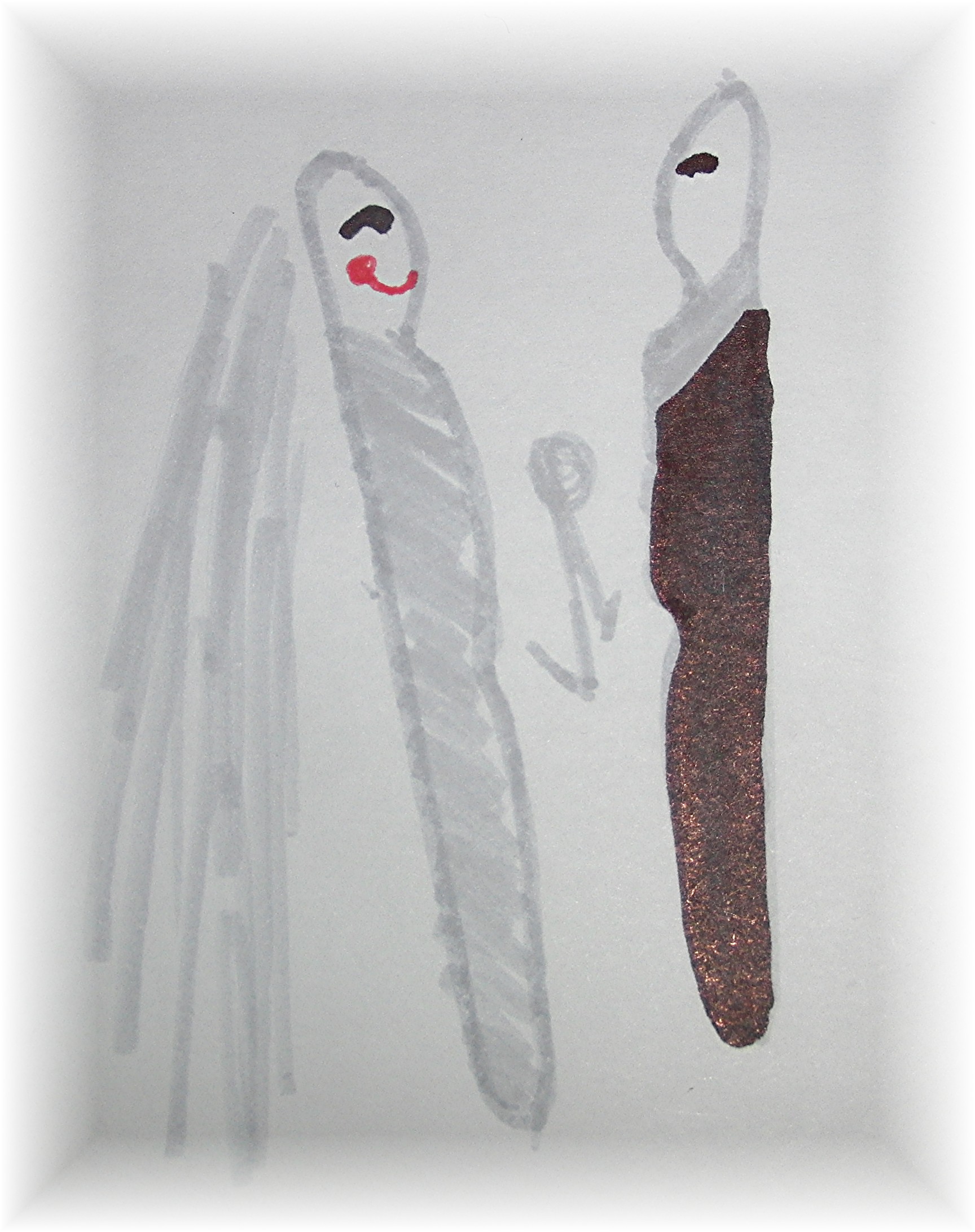 Mit einem dünnen Silberstift habe ich der Braut noch eine Perlenkette aufgemalt. Alles was auf der Zeichnung grau ist – soll natürlich mit weiss angemalt werden.
