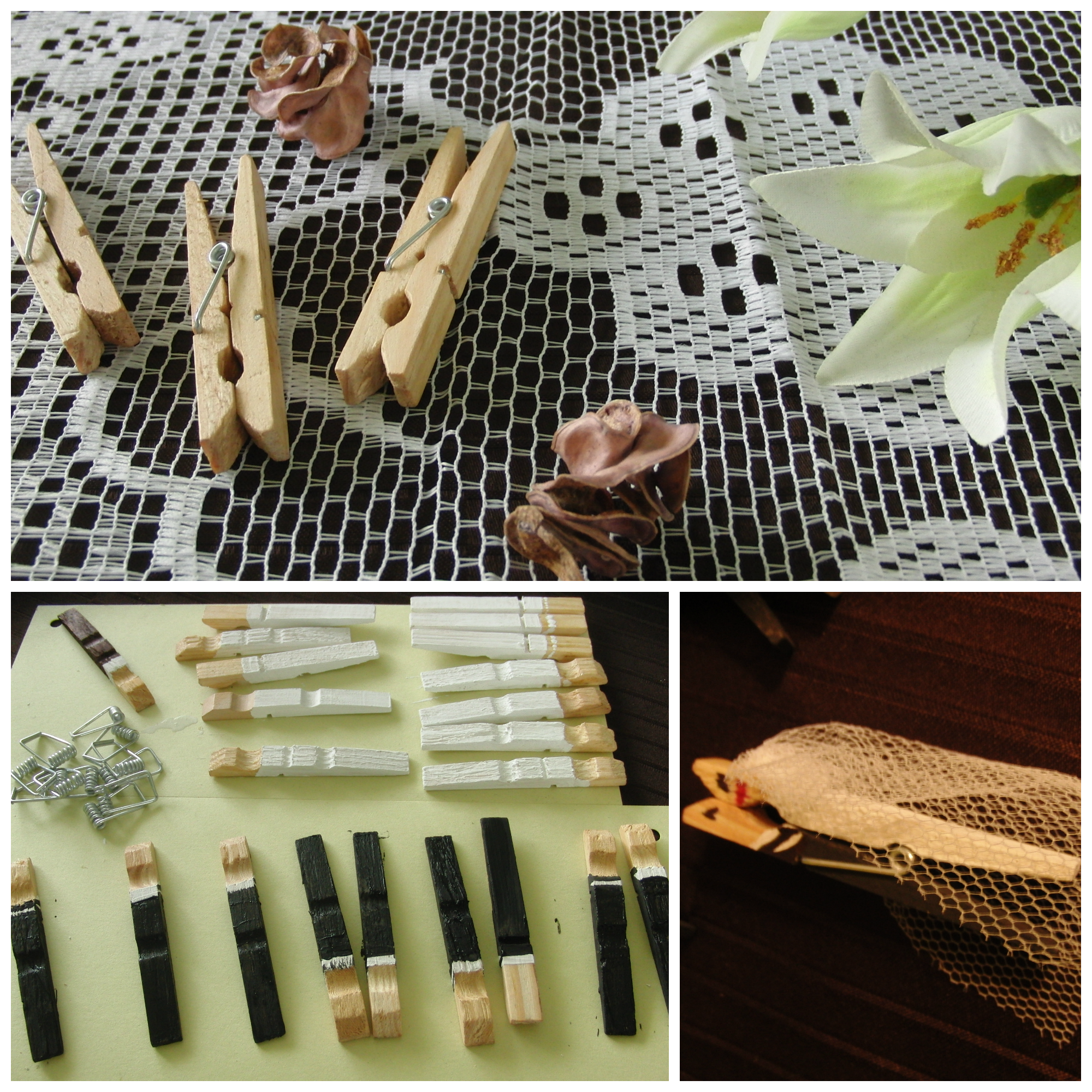 Holzwäscheklammern, Farbe in schwarz und weiss, Filzstift in rot, Tüll, Geschenkband und eine Heissklebepistole