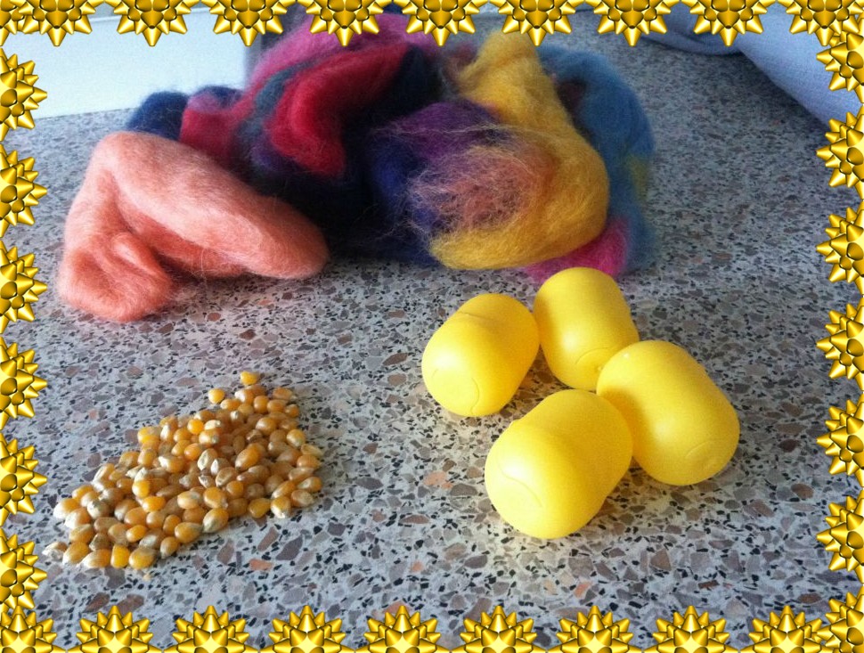 - Körner, Steinchen, Reis,…. was einem so einfällt, was man gerade im Haus hat. Die Möglichkeiten sind nahezu unbegrenzt. Ich habe Maiskörner genommen.