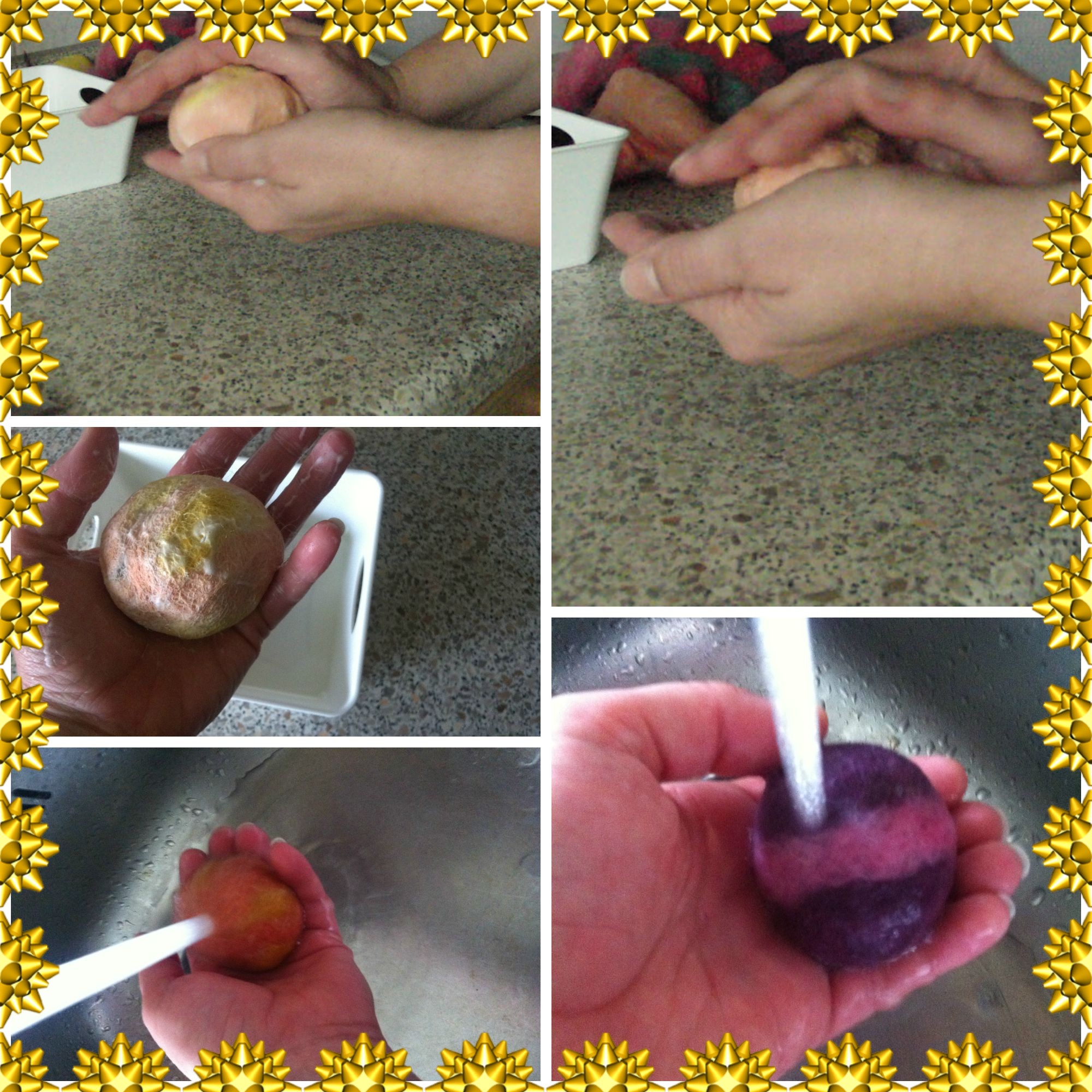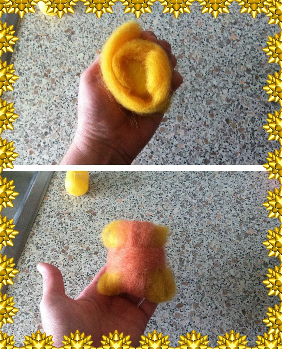 - je mehr Druck ausgeübt wird, dessto mehr verfilzt sich die Wolle um das Ei. Man merkt im rollprozess wie locker oder fest die Wolle um das Ei liegt