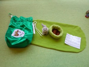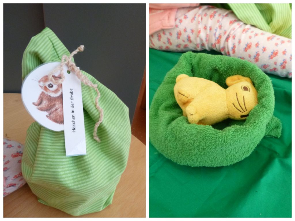 - Grube ( ich habe einen Waschlappen benutzt, den ich ineinandergefaltet habe. Etwas brauner Filz stellt die Erde in der Grube dar.)