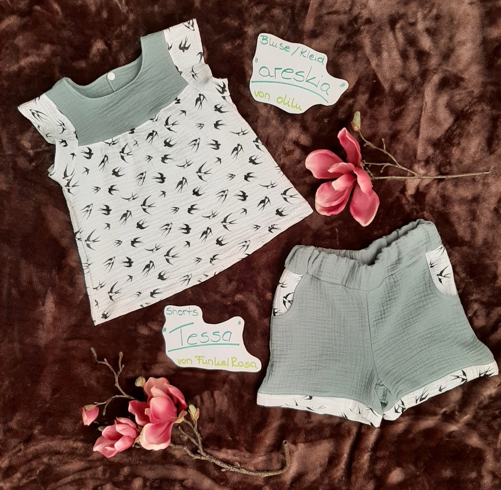 Zu der „Areskia“ von olilu aus Musselin, kam noch eine Shorts dazu. Dazu habe ich die Shorts „Tessa“ von Funkelrosa ausgesucht – als Schnittmuster.