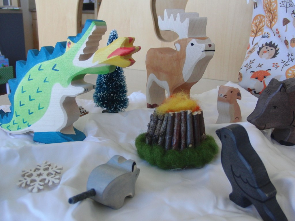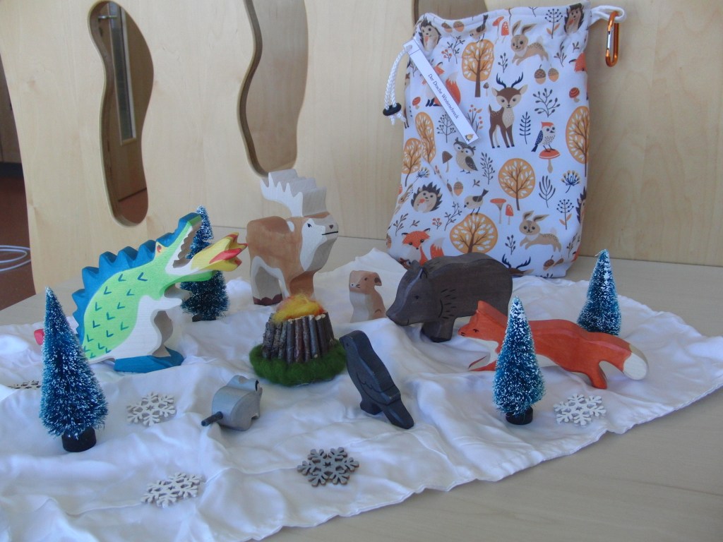 Tiere: Rabe, Hase, Wildschwein, Hirsch, Fuchs, Mäuschen, Drache. Ich habe die HolztigerTiere genommen.