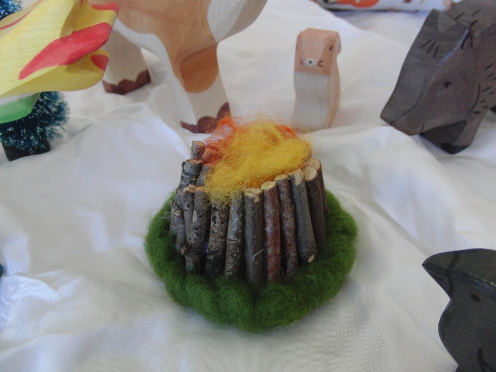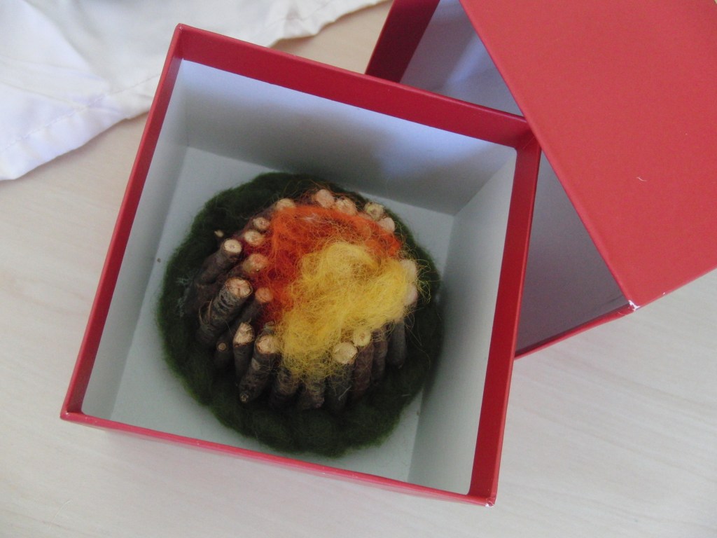 Lagerfeuer (selbst zusammengebaut mit Zweigstücke, etwas Märchenwolle, Heißklebepistole) – dazu eine Box