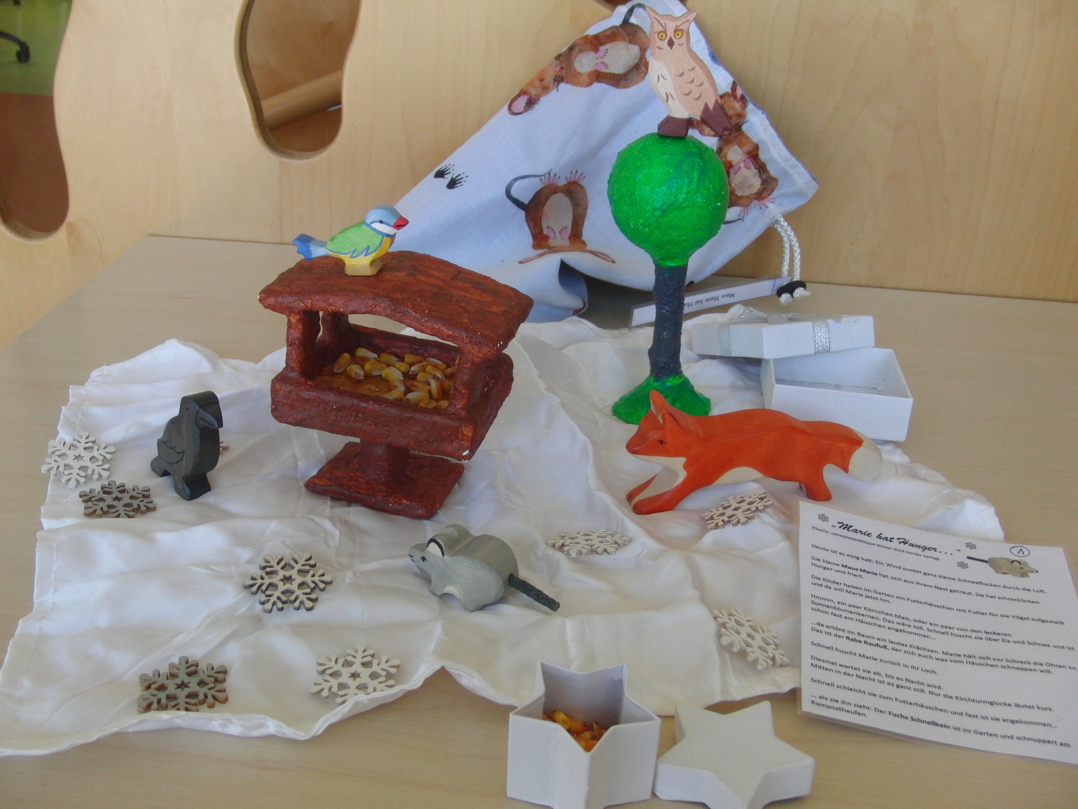 „Es ist Winter, die Maus Marie hat hunger und will sich im Schutz der Dunkelheit, etwas aus dem Vogelhäusschen holen.