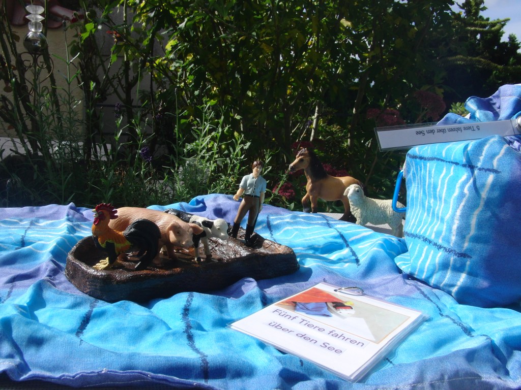 “ Ein Fährmann hat ein Boot. Er fährt damit über den See, von einem Ufer zum anderen. Nacheinander fragen die Tiere „Darf ich mitfahren?“. Der Fährmann: „Ja, du kannst einsteigen“. Alle Tiere fahren schließlich mit dem Boot über den See und steigen am anderen Ufer wieder aus.“