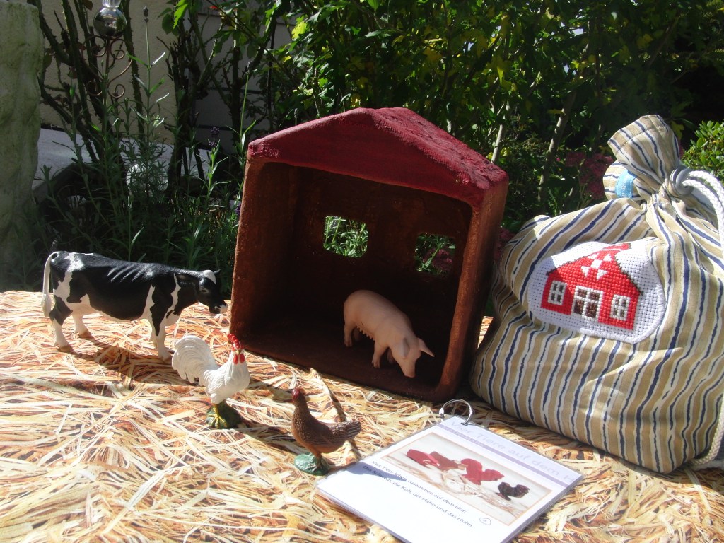 - Stall ist selbstgebaut aus einem Karton, zum Schluss mit Gipsbinden verstärkt und mit Acrylfarben bemalt