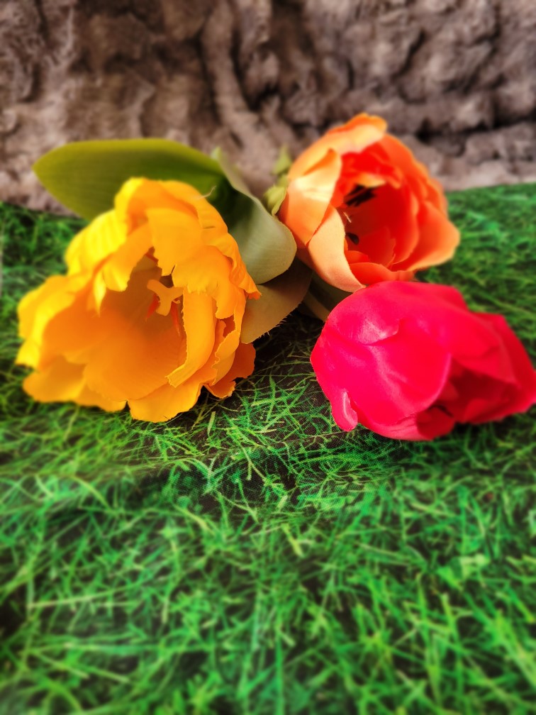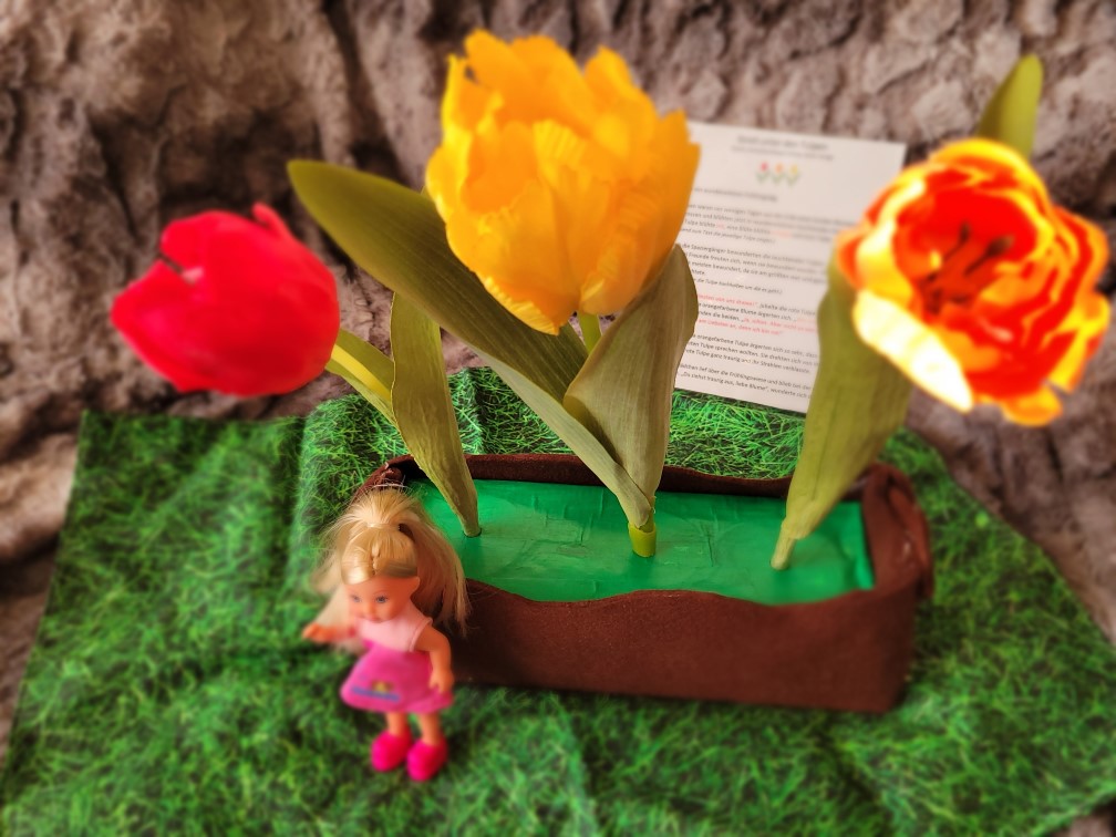„Drei Tulpen (rot, orange und gelb) haben begonnen zu blühen und werden von vielen Spaziergängern bestaunt, besonders die rote.. Die rote meint zu den beiden anderen, sie wäre die schönste. Lange Rede kurzer Sinn – die beiden wenden sich verärgert, von der roten Tulpe ab. Diese merkt dann erst wie einsam sie ist. Sie wendet sich wieder ihren Freunden zu und zusammen strahlen sie noch mehr…“