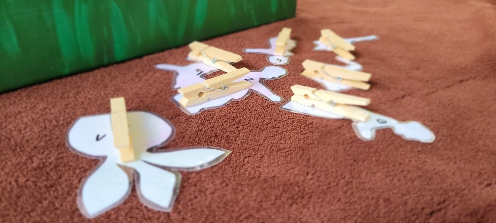 Die Figuren – einlaminiert und mit einer Wäscheklammer versehen. Um sie schneller zu finden auch mit Nummerierung.