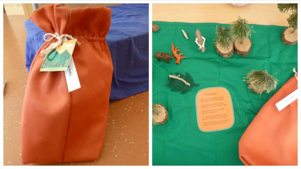 “ Auf einem Spaziergang im Wald kann man eine Menge Tiere entdecken: den Hirsch, den Fuchs, das Wildschwein, den Vogel, den Wurm. Und wenn sie sich erschrecken, dann werden sie sich verstecken…“