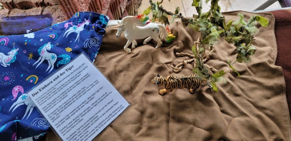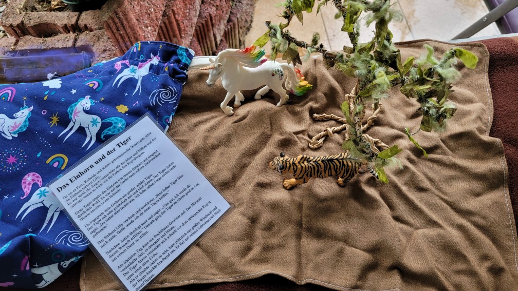 „In dieser Geschichte geht es um ein Einhorn, das eines Tages einen Tiger trifft. Dieser ist sehr hungrig und will das Einhorn fressen. Als dieses Bittet nicht gefressen zu werden, zieht sich der Tiger zurück. Einen Tag später stürmt es und der Tiger wird unter einem umfallenden Baum gefangen. Das Einhorn kommt vorbei und hilft dem Tiger – weil er es nicht aufgefressen hat. Beide werden Freunde“