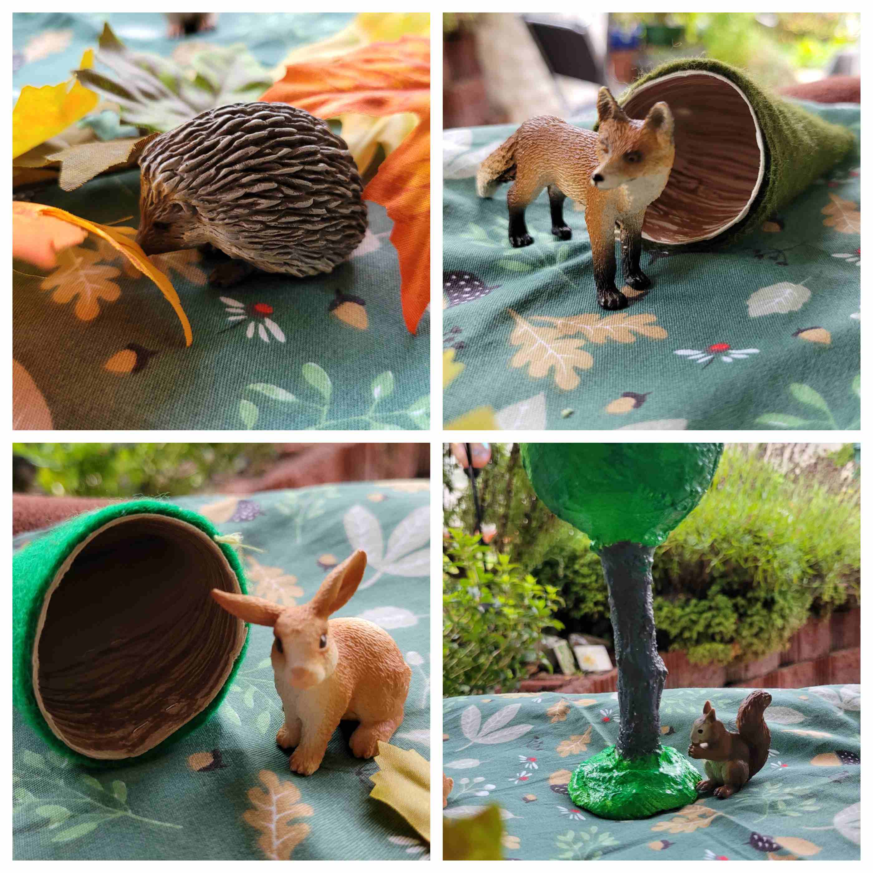 • Behausungen von Fuchs und Hase (Bau): Toilettenpapierrolle, Filz, Filzstifte, Kleber, Tacker