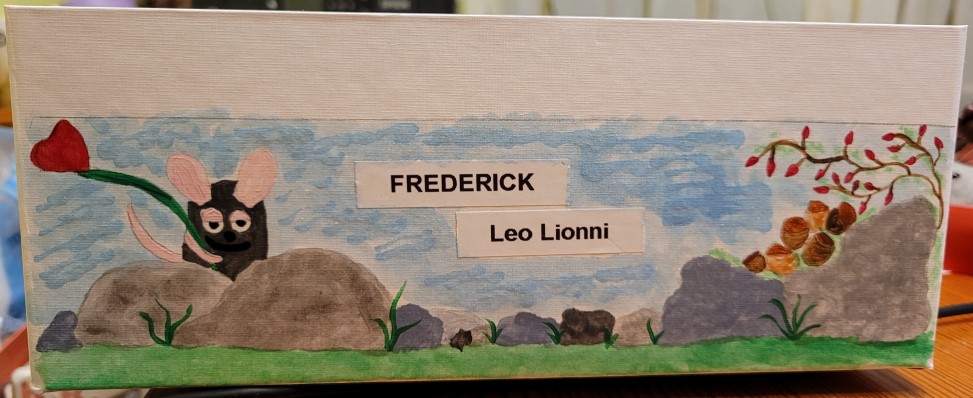 Da die Boxen im Kindergarten, übereinander gestapelt werden (deswegen habe ich auch die gleichen) muss ich ja irgendwie wissen, welche Geschichte drin ist. Deshalb schreibe ich schonmal mit unserem Beschriftungsgerät den Titel drauf.