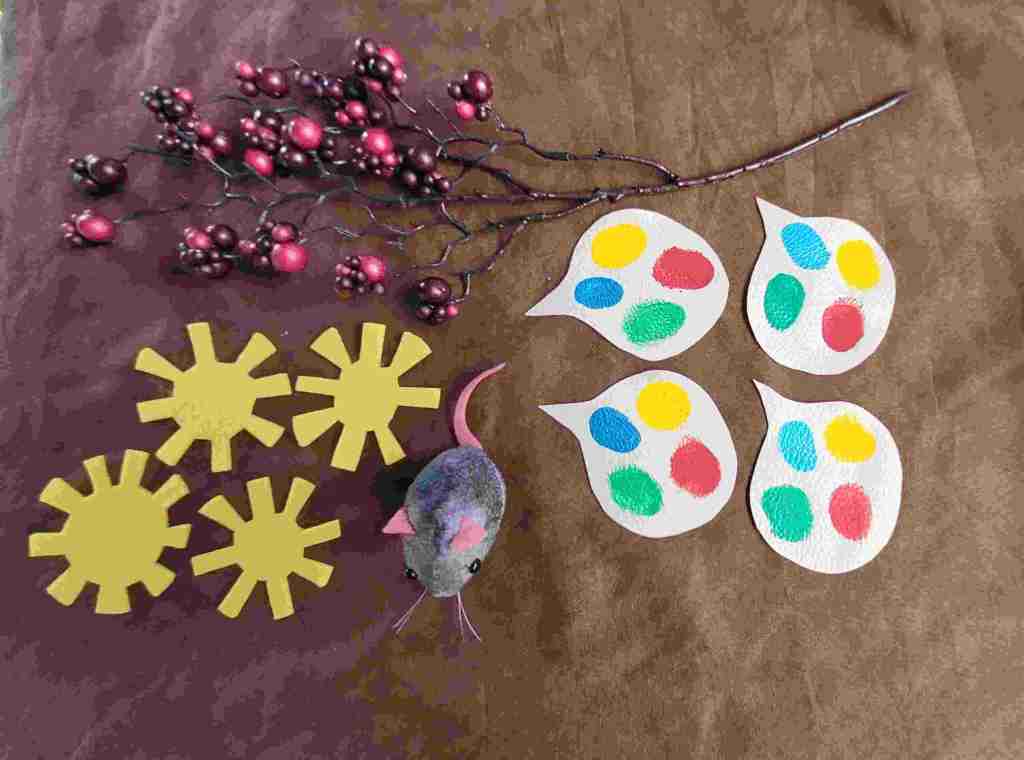 Die Sonnen habe ich aus dem gleichen Filz gemacht wie die Ähren (Stärke 4mm). Die Blasen mit den Farben sind aus hellem Kunstleder ausgeschnitten. Ich habe für die Farbklekse Acrylfarben benutzt, die ich mit dem Finger draufgetupft habe.