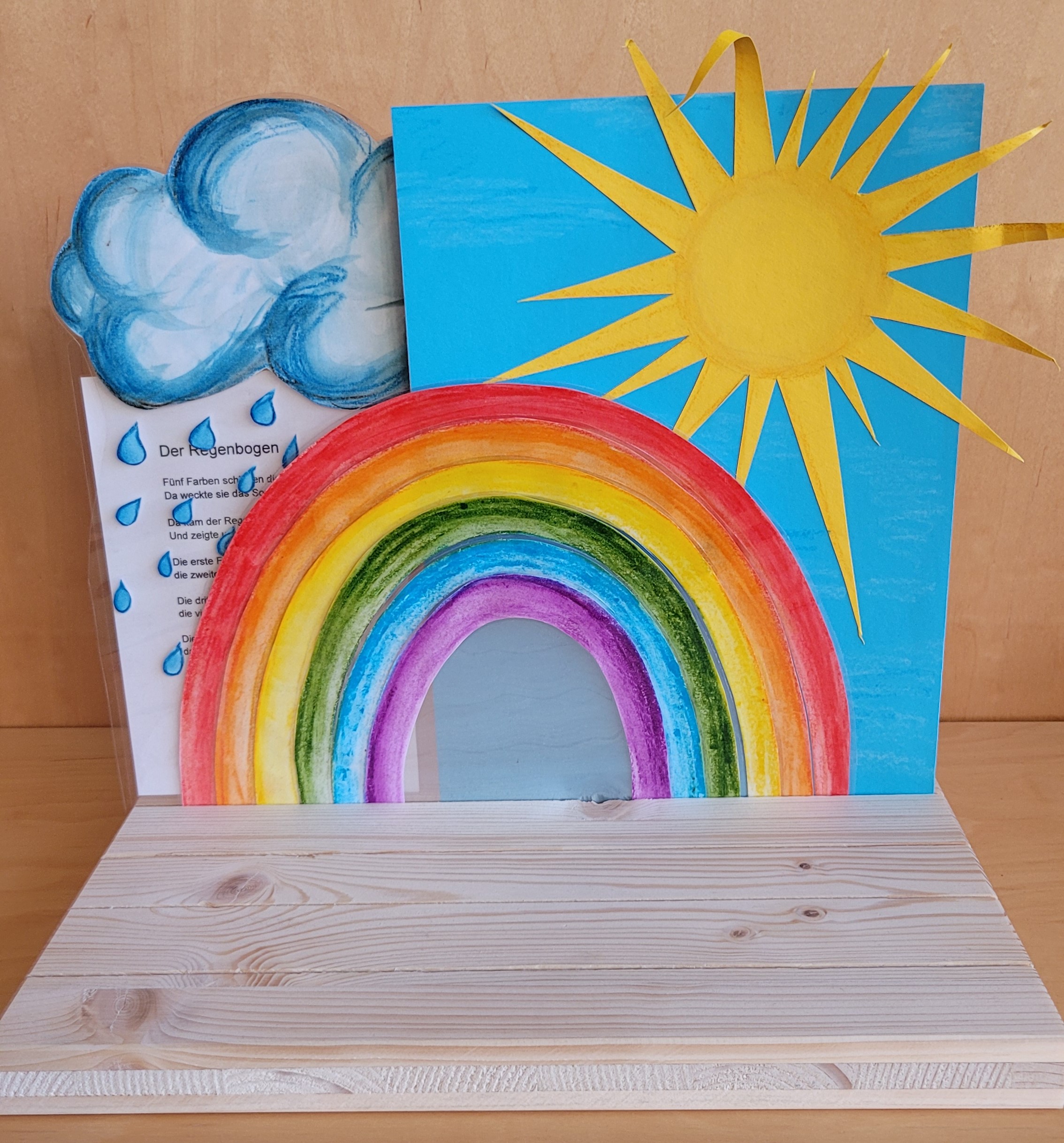 Ich wurde gerade in der Facebookgruppe: „Geschichtensäckchen, Kofferabenteuer und Tischtheater für Kinder“ gefragt warum der Regenbogen nur 6 Farben hat… Ähm – gute Frage, die ich gleich mal Google gestellt habe! Tatsächlich hat ein Regenbogen 7 Farben: von außen nach innen sind das: rot, orange, gelb, grün, blau, indigo und violett. Wieder was dazugelernt. Ich hatte mir da tatsächlich keine Gedanken gemacht.