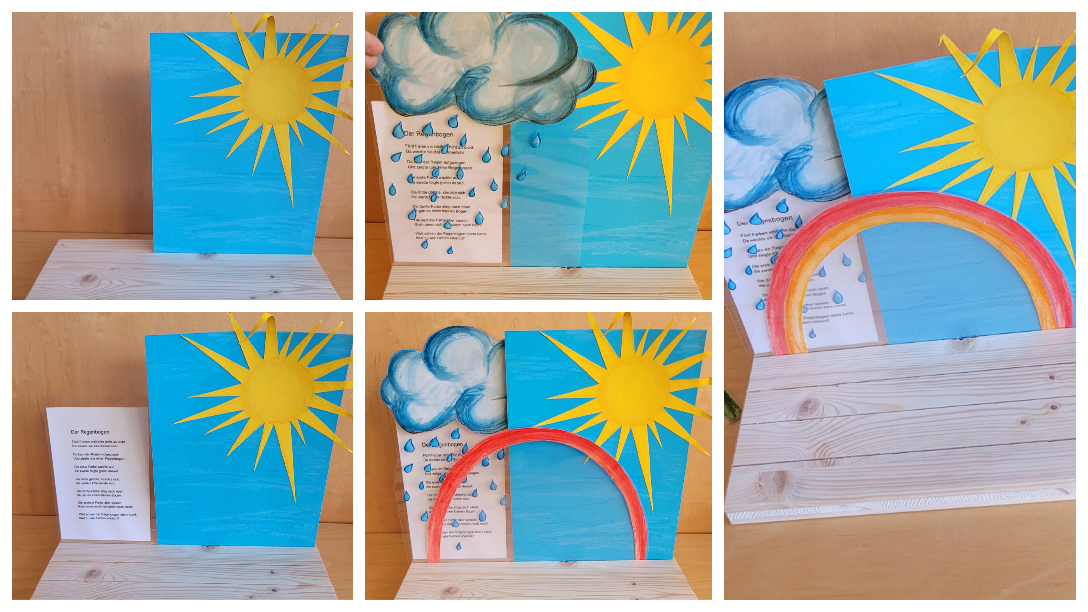 Die einzelnen Bögen sind einlaminiert und werden nach und nach in die Schiene gelegt. Die Sonne besteht aus Karton und Papier, die Regenwolke incl. Regentropfen ist laminiert.