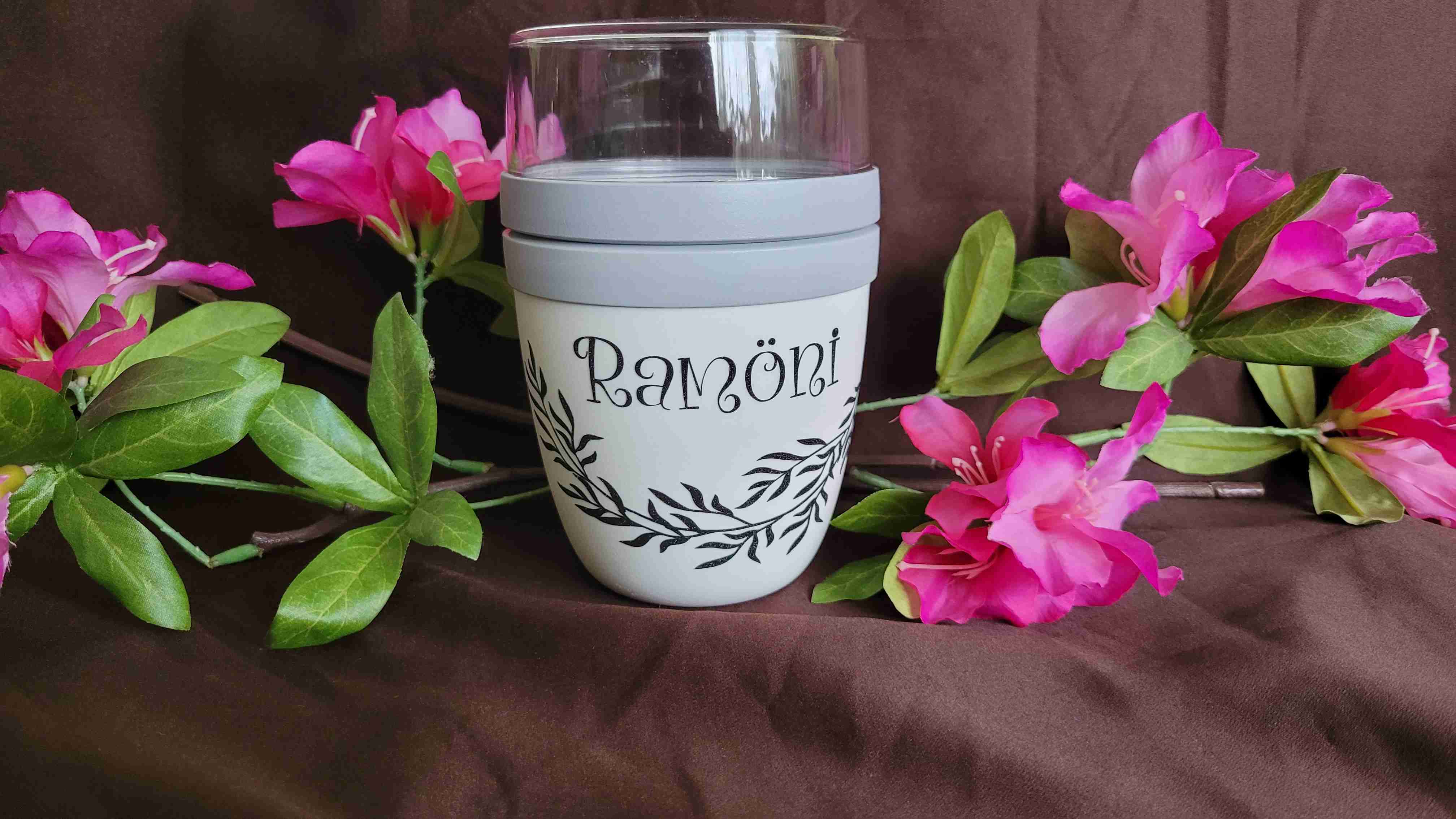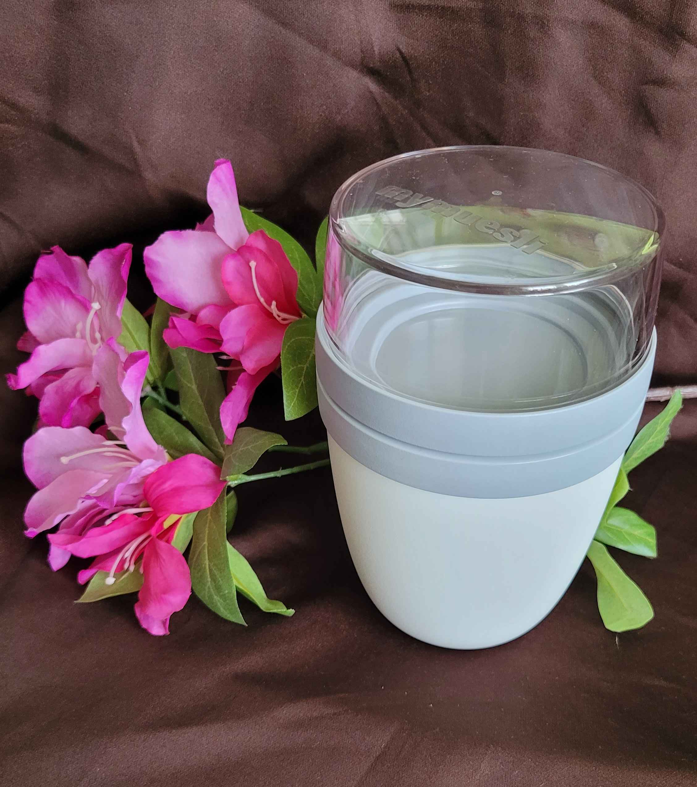 Seit einer Weile, nehme ich mir in die Arbeit gerne etwas Joghurt mit Früchten mit. Den Becher habe ich schon seit ein paar Jahren. Er stammt von mymuesli – und es gibt sie noch in verschiedenen Farben und Größen. Meiner hat tatsächlich die Größe wie auf dem Bild.