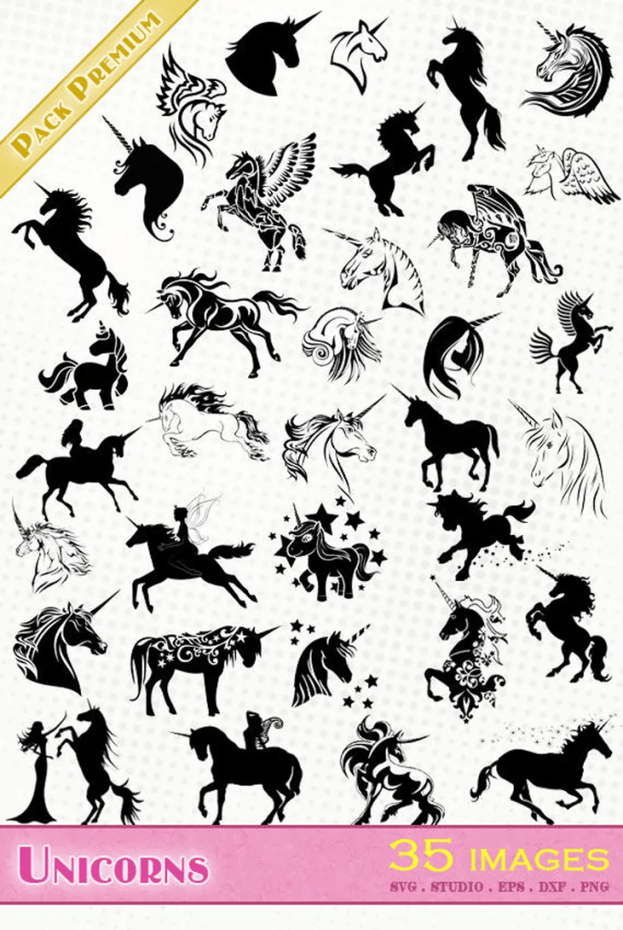 Einhörner – 35 svg/dxf/eps/silhouette studio/png – Silhouetten, Feile, Clipart