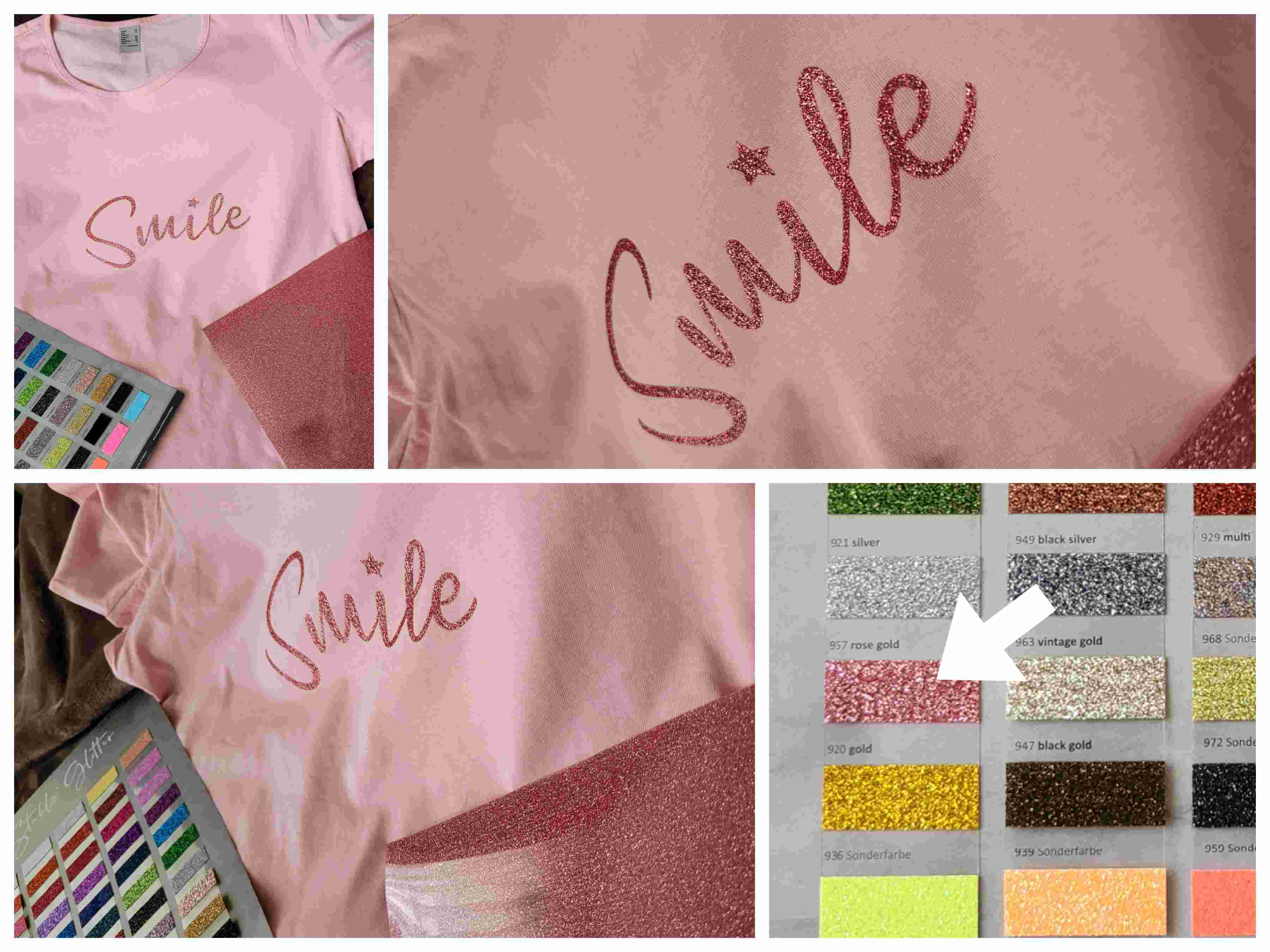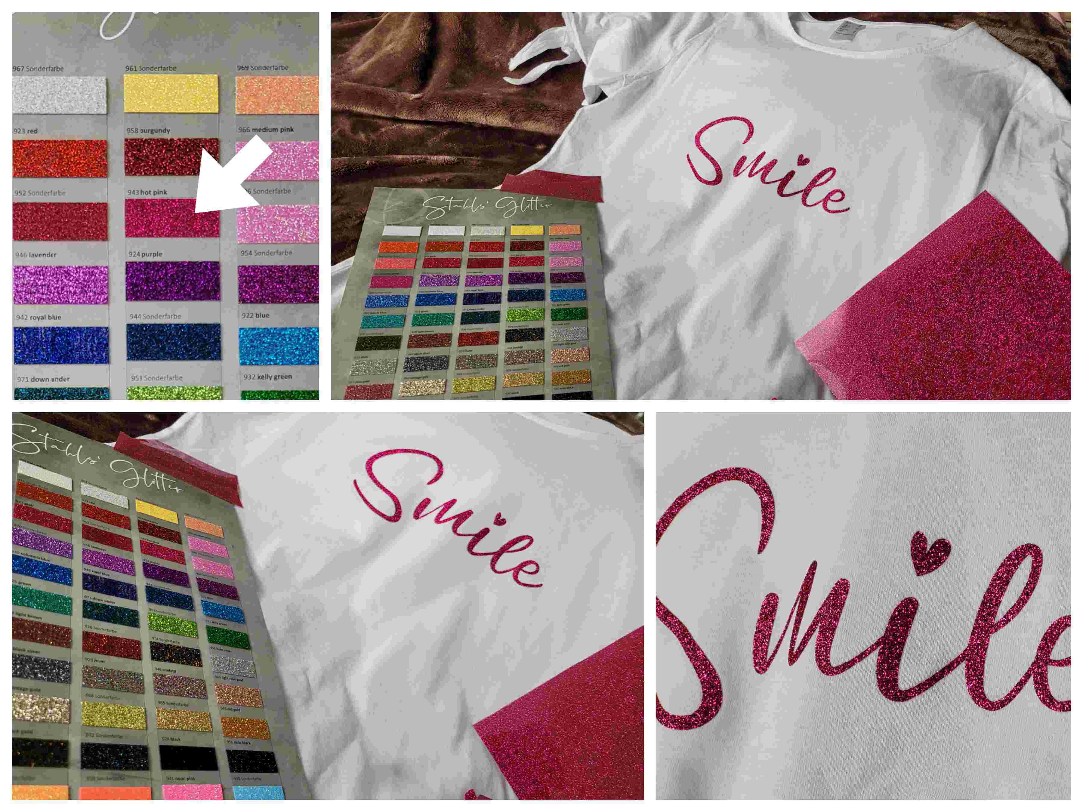 Zuerst sollten die Damen sich erstmal klar werden, welche Glitzer-Folien-Farbe sie dafür haben wollen… Dazu hatte ich im Vorfeld einmal die Folienmuster / Farbtabelle von Stahls Glitter Flexfolie bestellt – und was soll ich sagen – sich zu entscheiden ist sooooooooo schwer!!!! Oder?