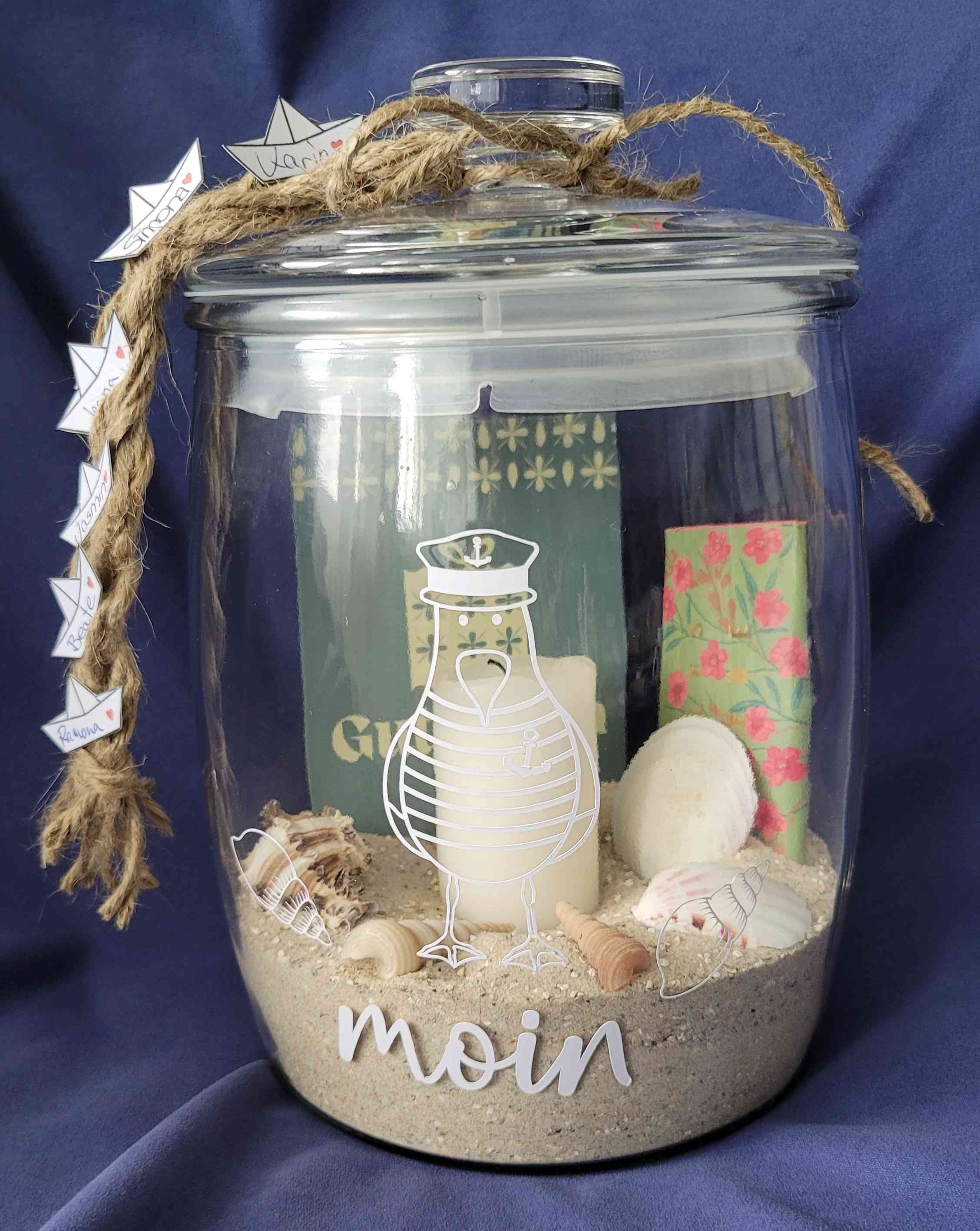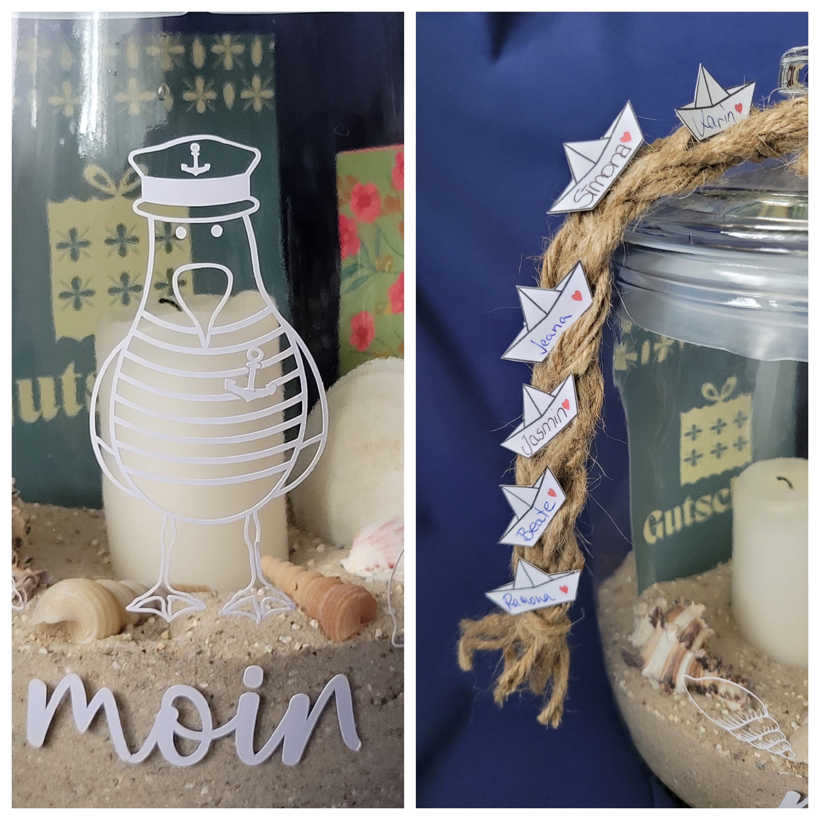 Zum Schluss noch ein paar ausgedruckte Schiffchen (eine jpg aus dem www) mit all unseren Namen drauf (mit Heißkleber befestigt).