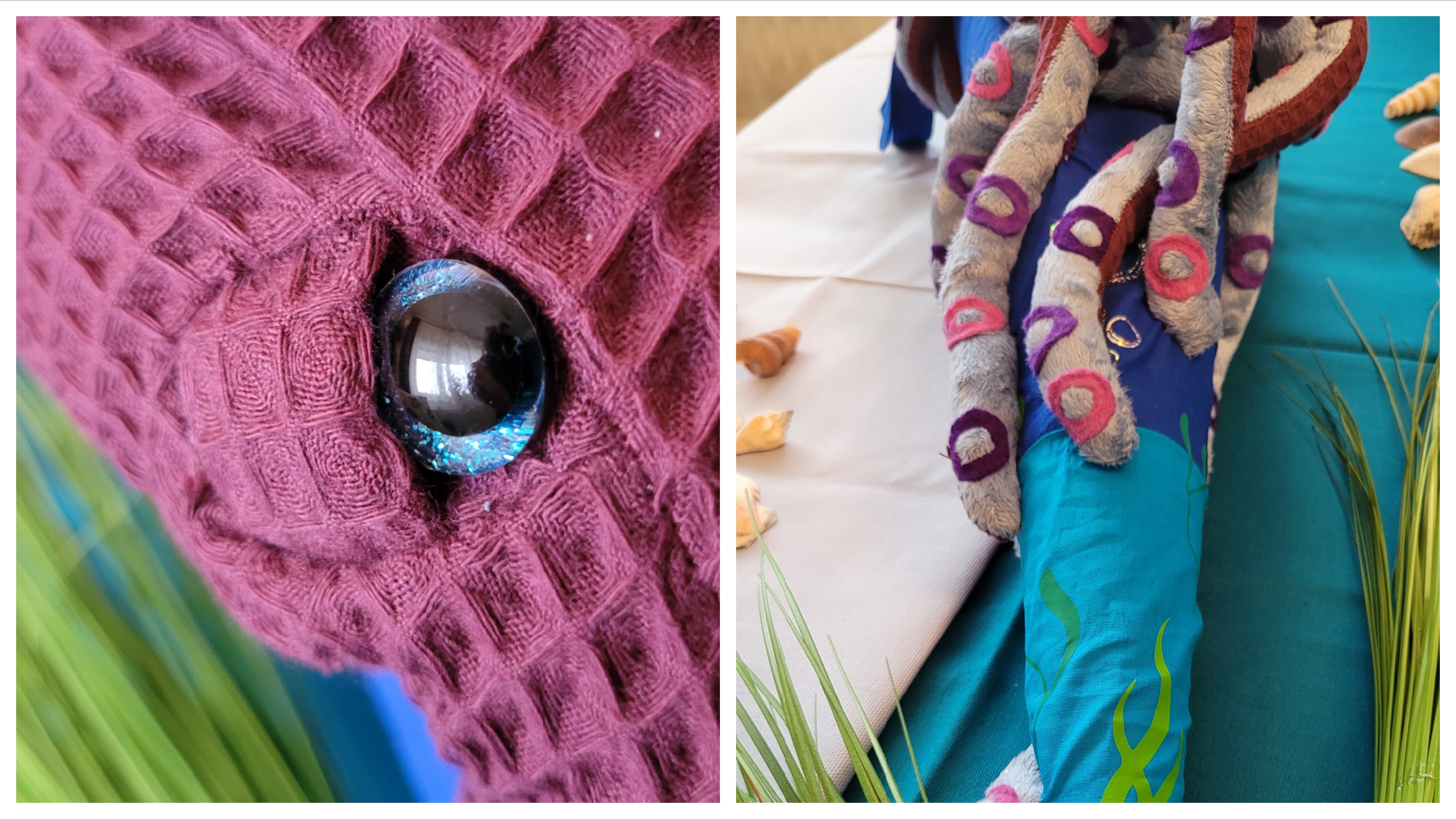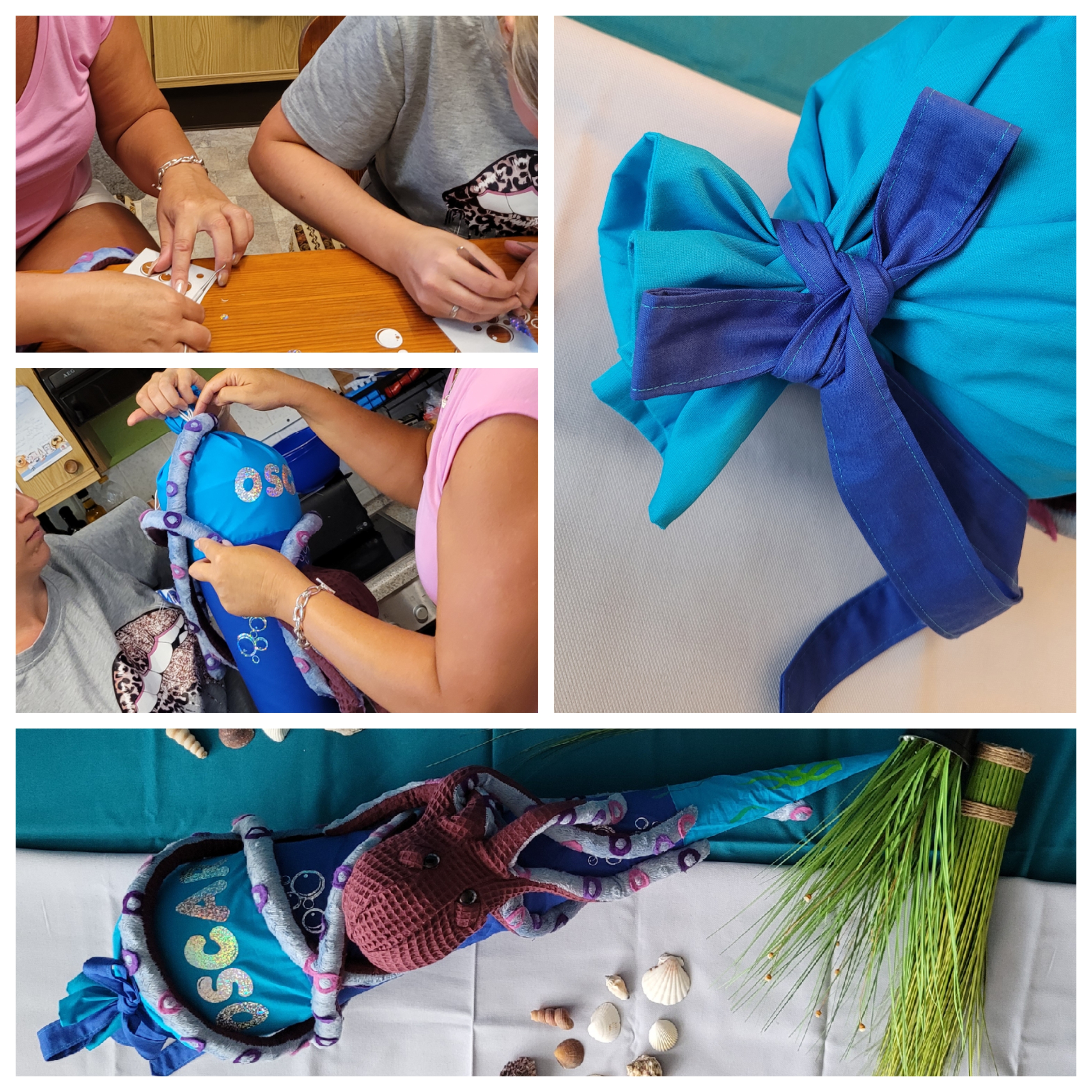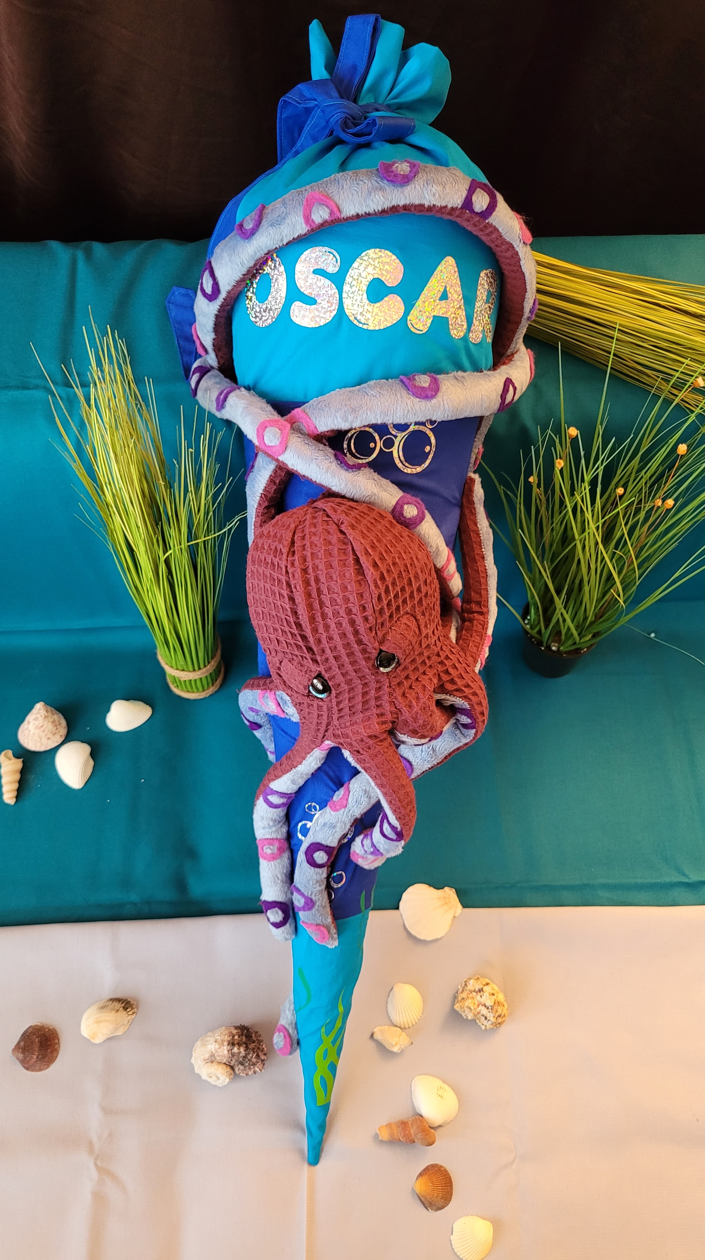 Zum Schluss haben wir gemeinsam die Kraken-Tentakeln mit Nadeln fixiert. Diese habe ich ein paar Tage später noch an die Schultüte festgenäht (jeweils mit ein paar Stichen).