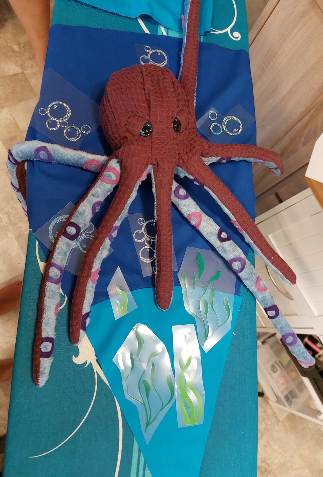 Die Stoffe waren endlich ausgesucht, es ging an den Zuschnitt. Nebenher hat meine Freundin die Krake gestopft… Vor allem die langen Tentakeln hatten es in sich – das dauerte…