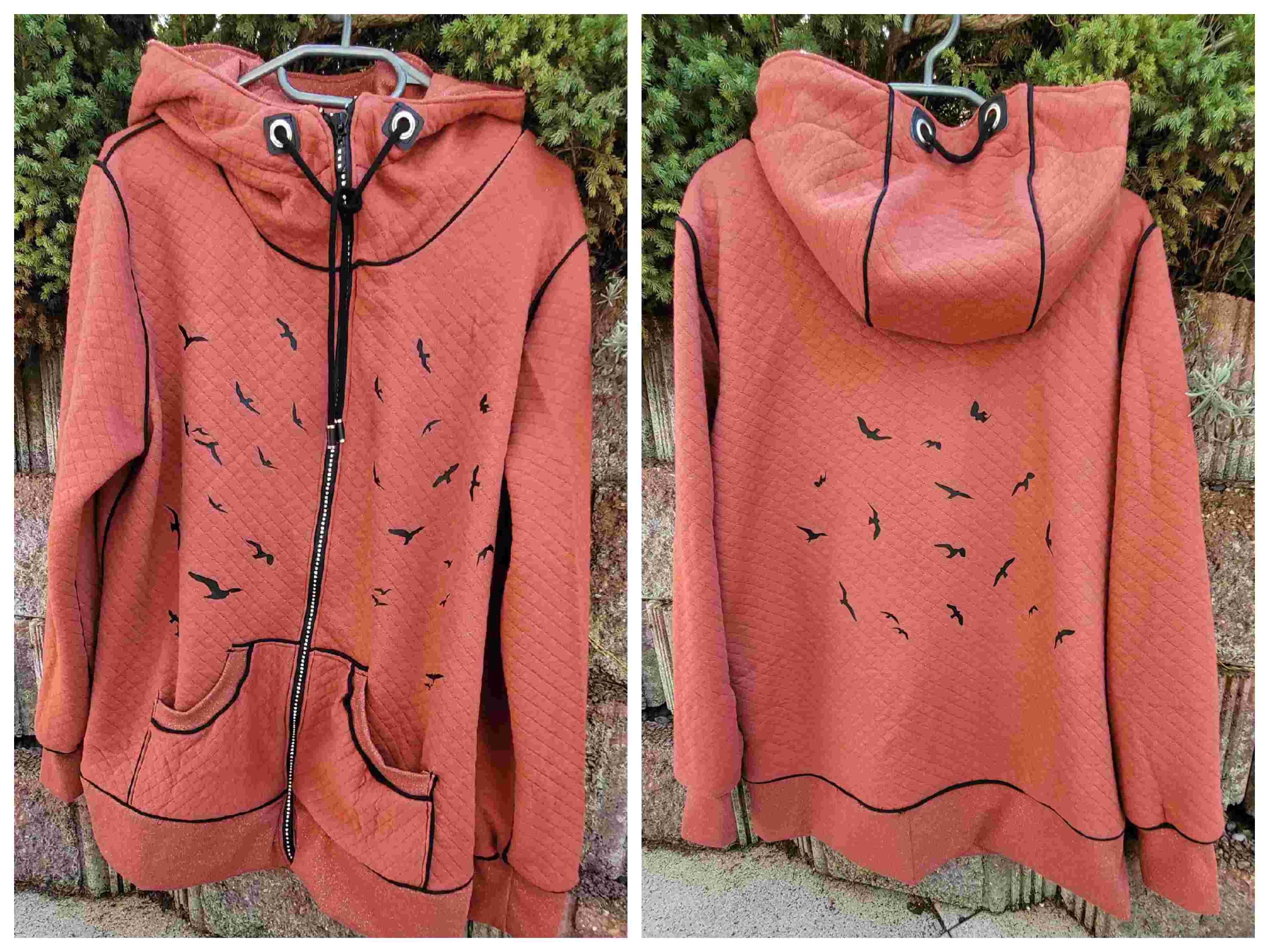Diese Sweat-Jacke habe ich neulich erst fertiggenäht, fand sie jedoch etwas langweilig. Daher habe ich überlegt was ich draufplotten könnte. Ich wollte keinen Spruch, sondern einfach etwas neutrales. Die Entscheidung stand zwischen einem Vogelschwarm oder Hängepflanzen (*lach* ja, hängende Pflanzen – hätte sicher auch cool ausgesehen. Ein anderes Mal…)