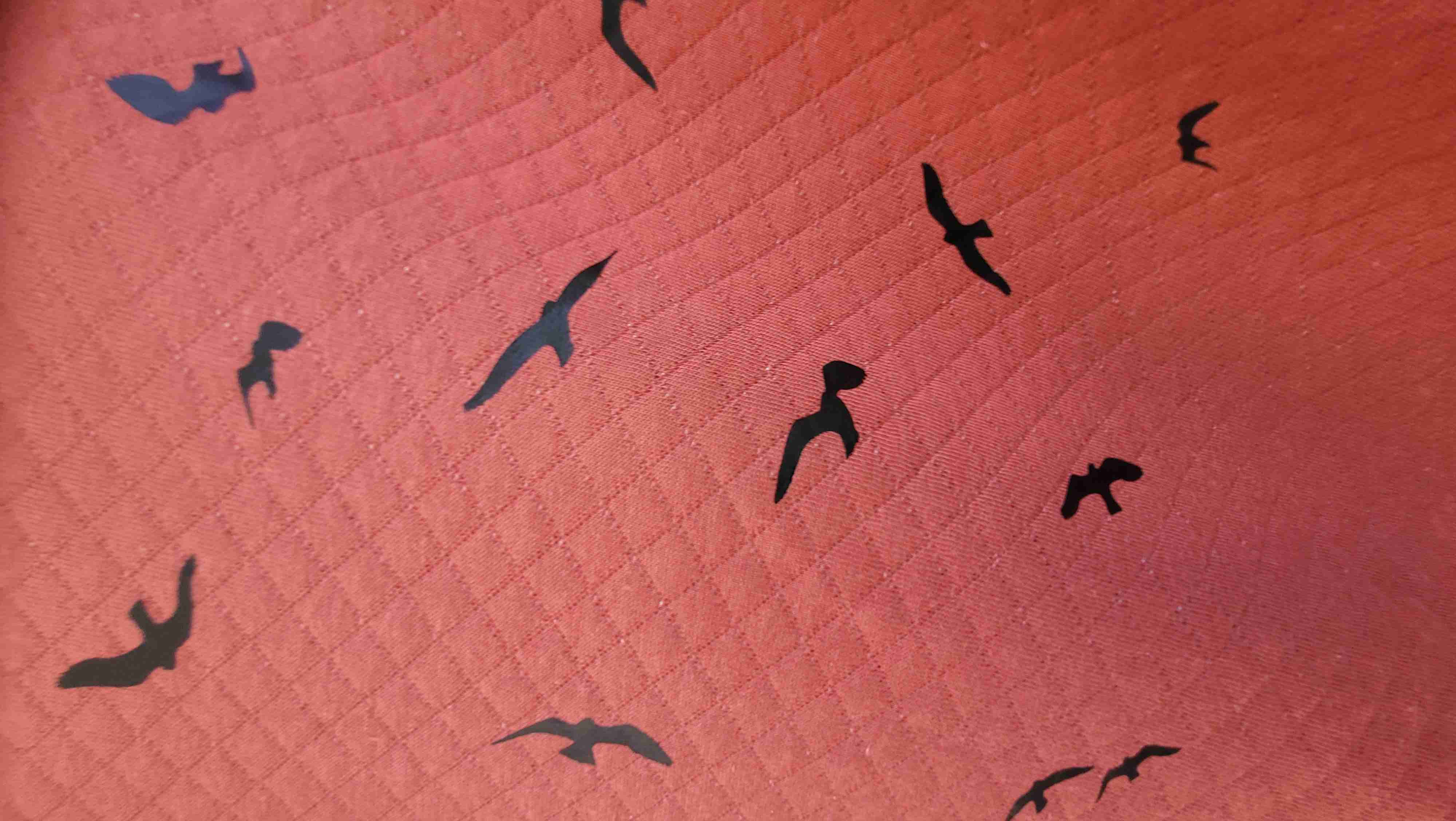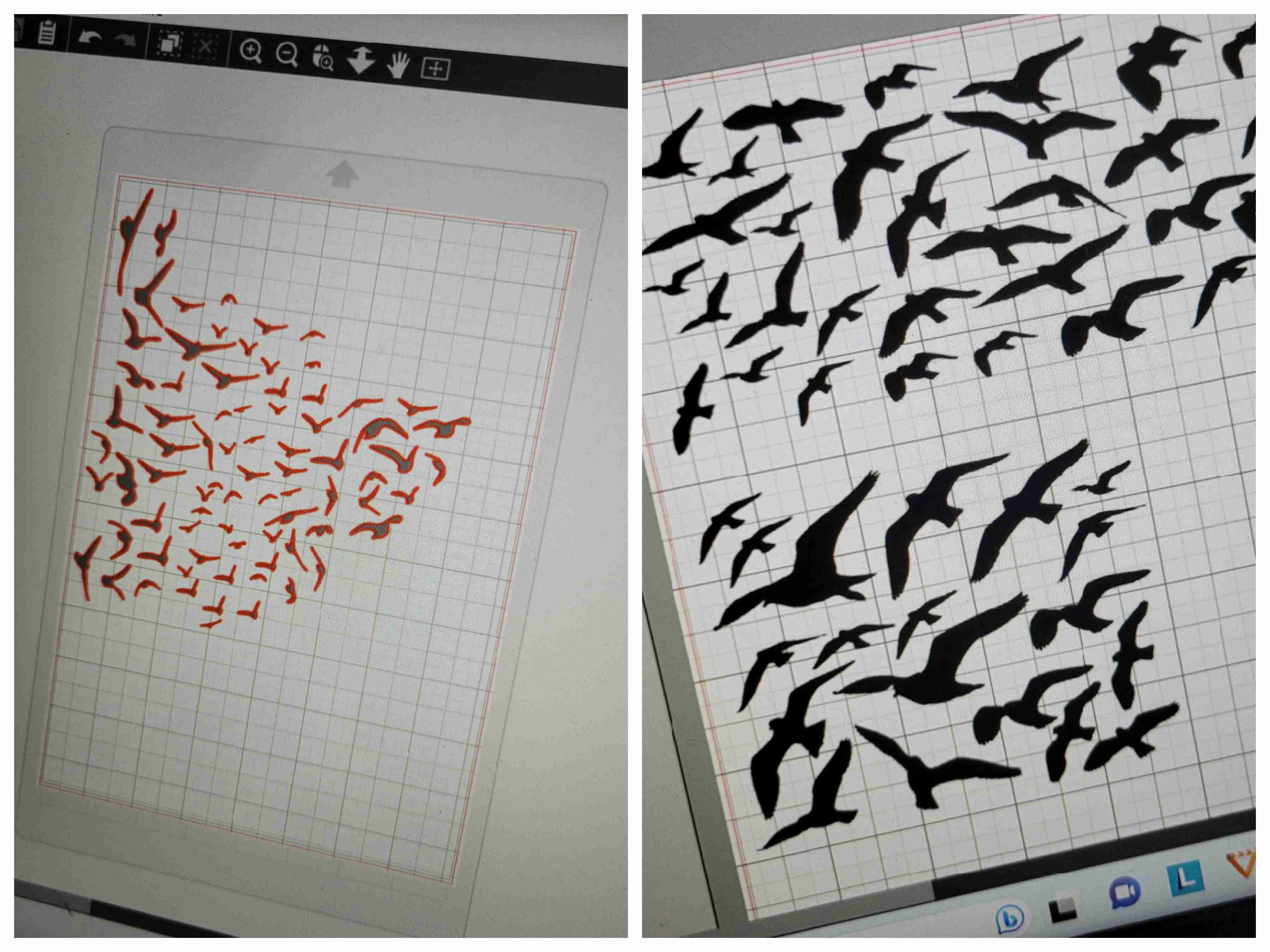 Geplottet habe ich sie auf eine ganz normale Heat Transfer Vinyl Folie in schwarz, bzw. auf ein paar Reststücke-daher auch das komische Verteilsystem… Einige der Vögel habe ich etwas größer gemacht, andere so gelassen, andere wiederum öfters kopiert.