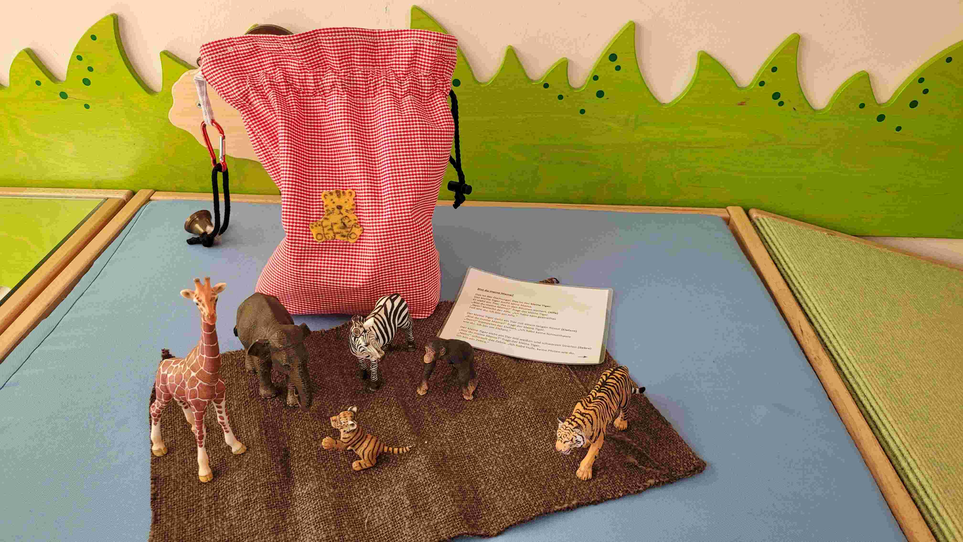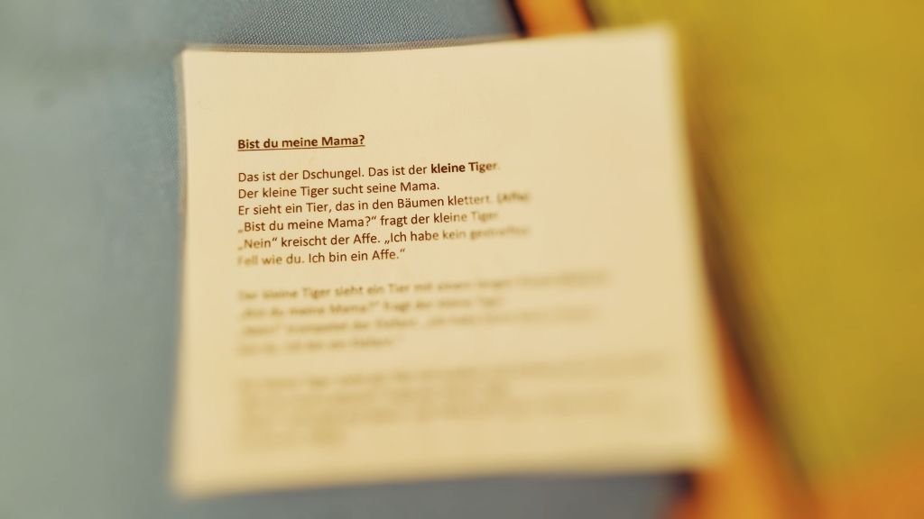 Leider kann ich nicht nachvollziehen, woher meine Kolleginnen den Text haben, deswegen ist er nicht ganz zu sehen. Aber das Schema ist gleich: der Tiger trifft erst einen Affen, dann einen Elefanten, ein Zebra und eine Giraffe. Erst am Schluss findet der kleine Tiger seine Mama.