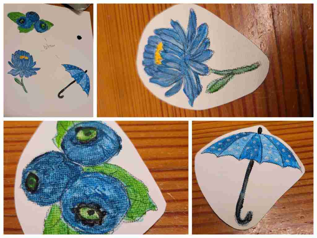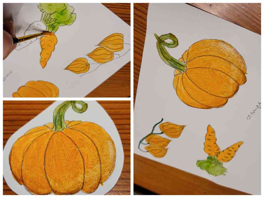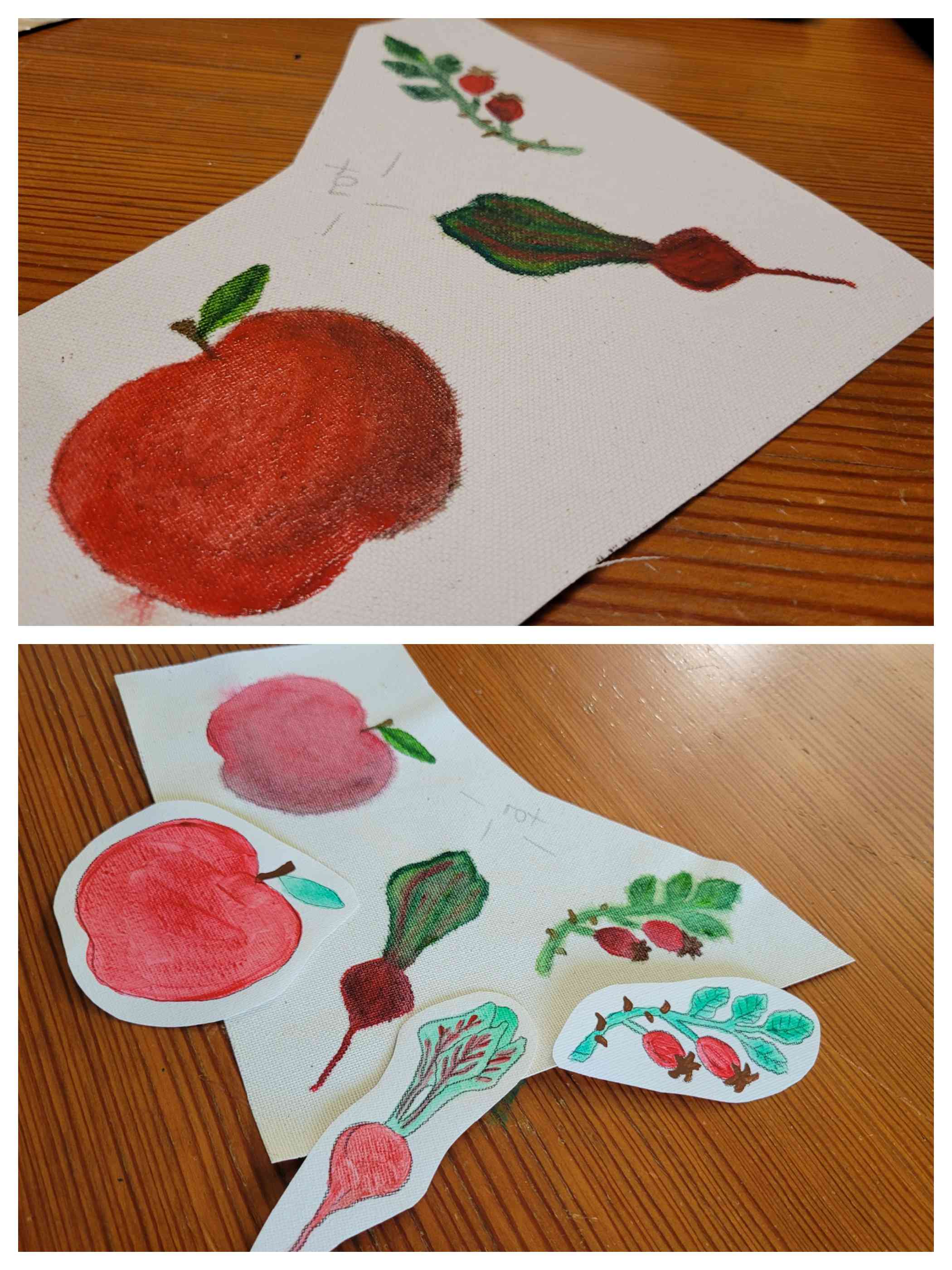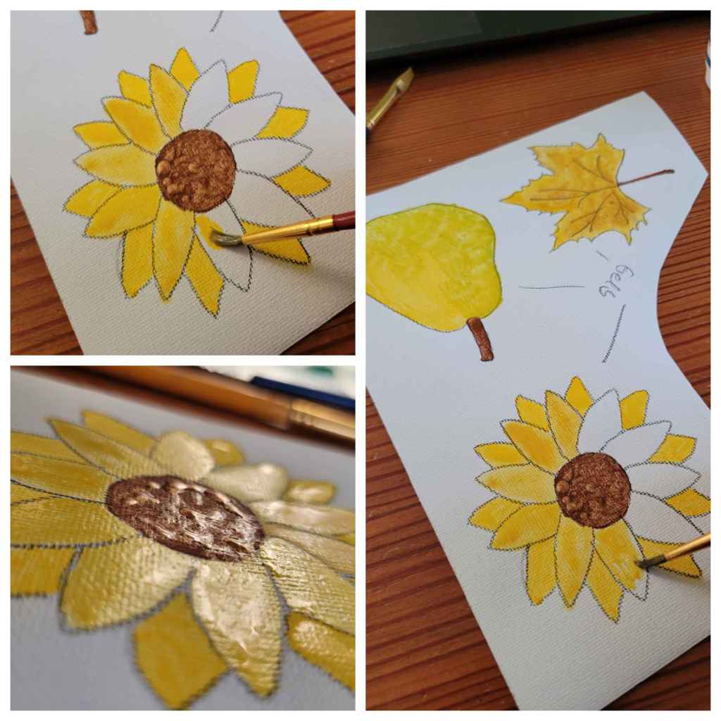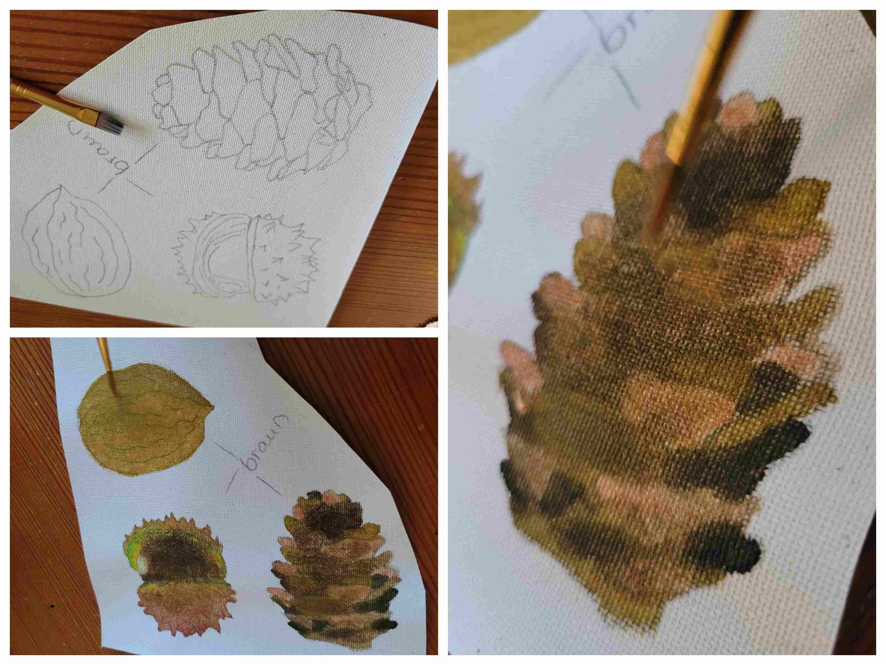 Zu den einzelnen Farben habe ich Dinge gesucht, die es im Herbst gibt. Übertragen auf Canvas Papier (geeignet für Acryl, Ölfarben und ähnliches), habe ich sie mit Acrylfarben angemalt. Die Roten waren mir etwas ausgelaufen, daher habe ich sie nochmal neu gemacht.