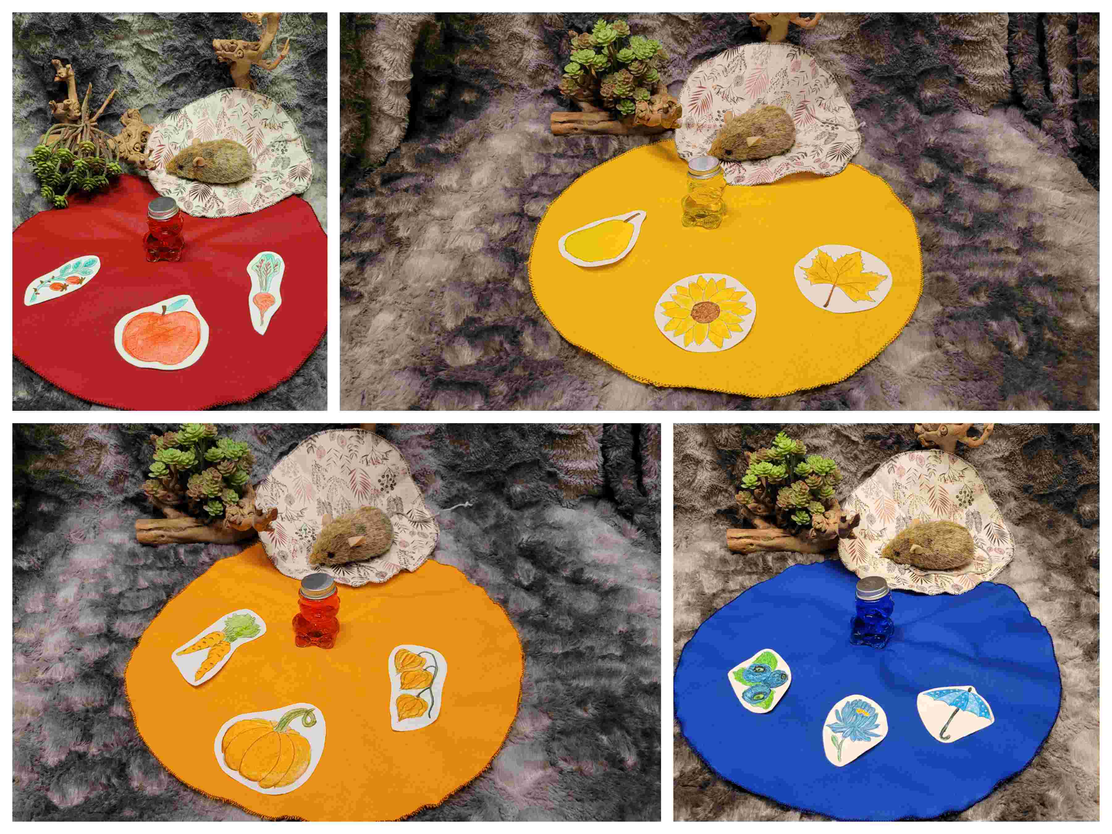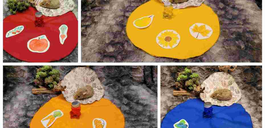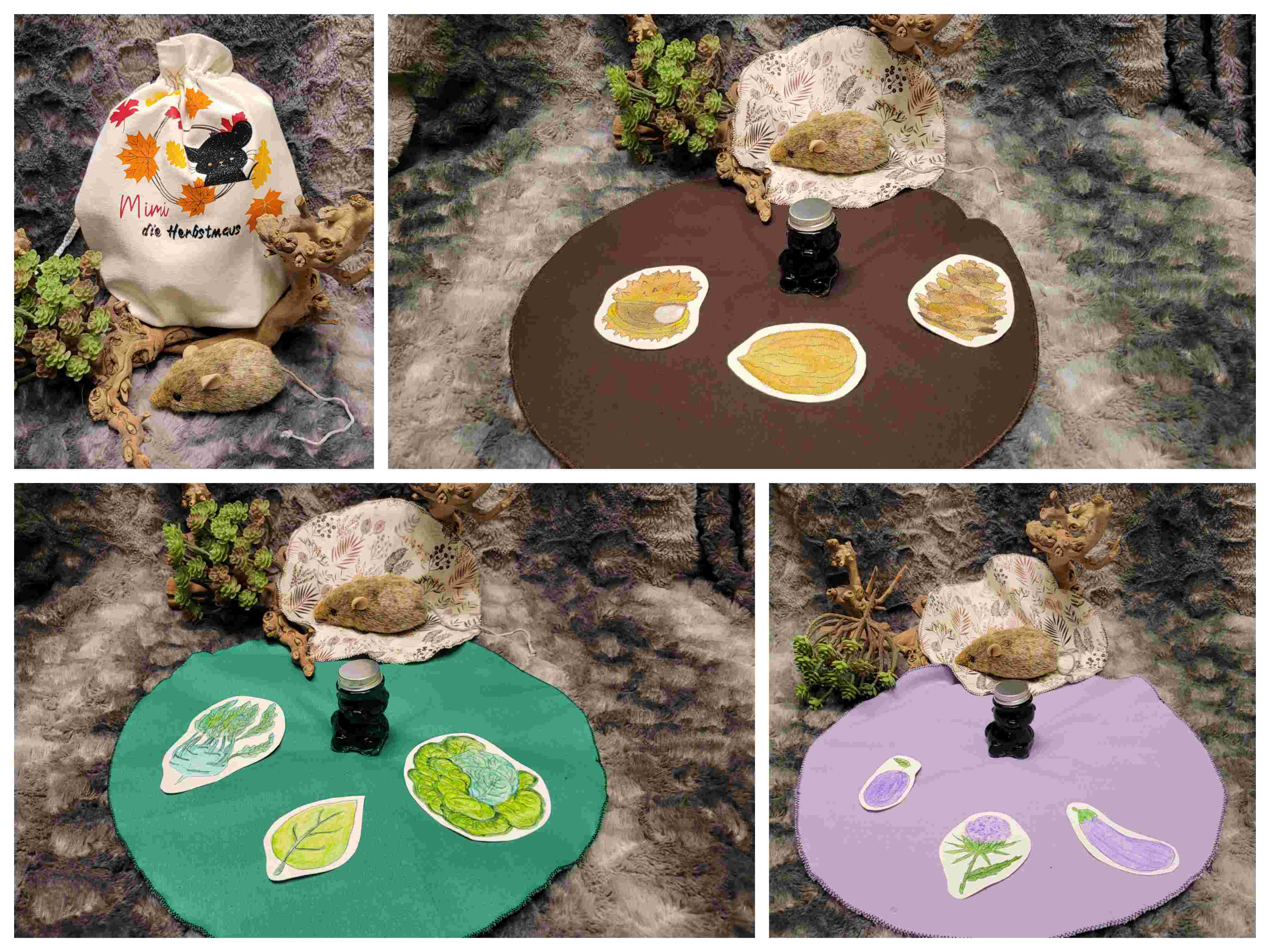 Dazu bekommt die Maus noch jeweils in den Farben ein Tuch dazu – dies kommt am Anfang heraus und jedes Bärchen „erkennt“ seine Farbe und stellt sich drauf. Dann zeigt die Maus die gefundenen Sachen und auch in diesen, entdecken die Bären ihre Farben und bekommen die Dinge auf ihr Tuch gelegt.