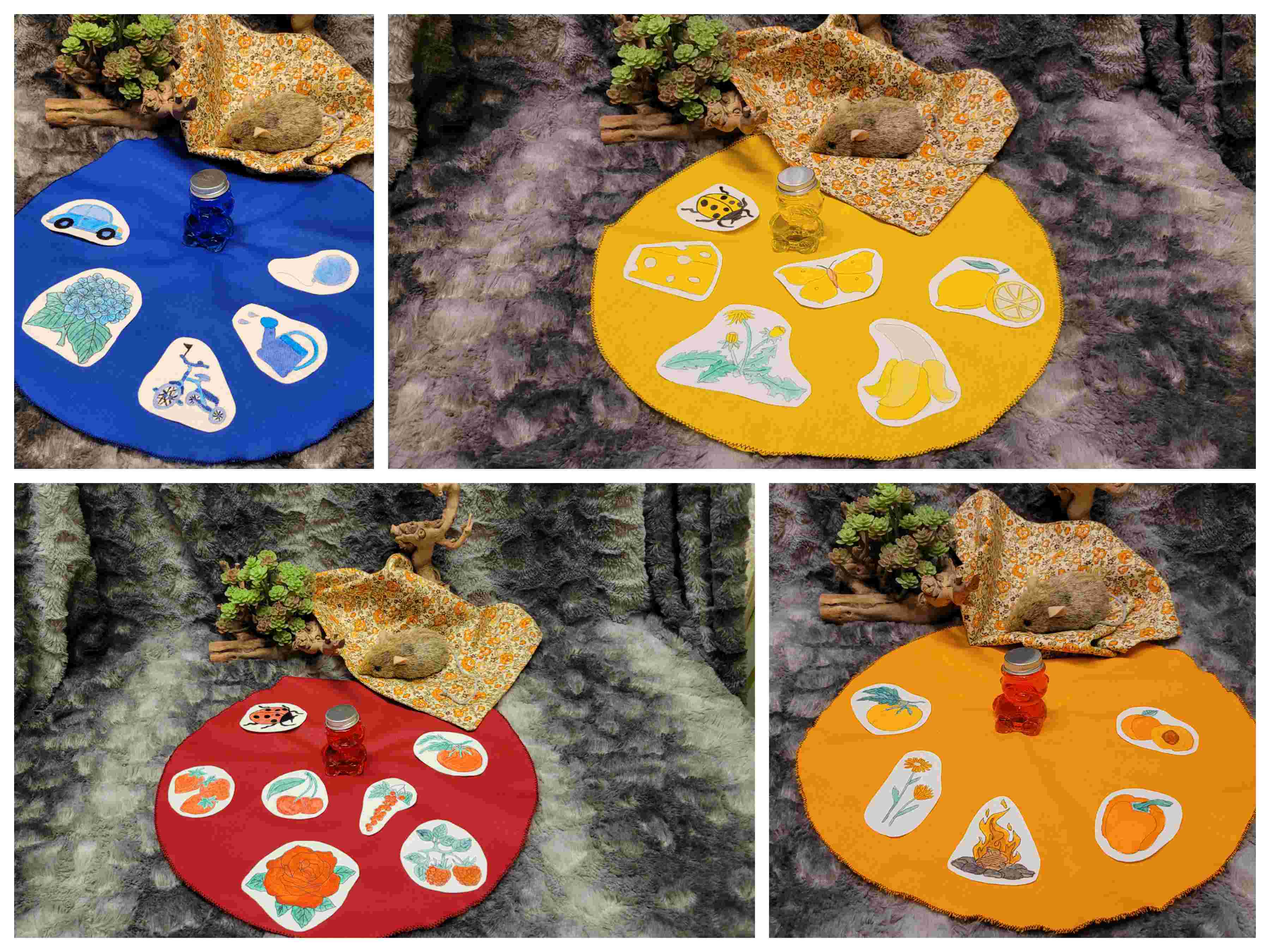 Dazu bekommt die Maus noch jeweils in den Farben ein Tuch dazu – dies kommt am Anfang heraus und jedes Bärchen „erkennt“ seine Farbe und stellt sich drauf. Dann zeigt die Maus die gefundenen Sachen und auch in diesen, entdecken die Bären ihre Farben und bekommen die Dinge auf ihr Tuch gelegt.