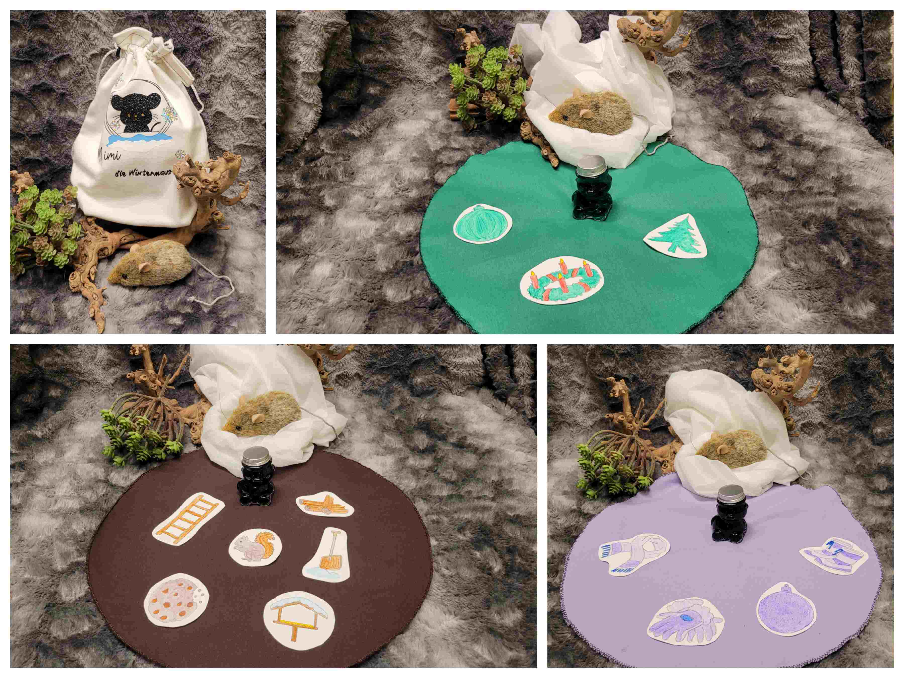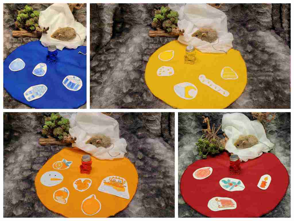 Dazu bekommt die Maus noch jeweils in den Farben ein Tuch dazu – dies kommt am Anfang heraus und jedes Bärchen „erkennt“ seine Farbe und stellt sich drauf. Dann zeigt die Maus die gefundenen Sachen und auch in diesen, entdecken die Bären ihre Farben und bekommen die Dinge auf ihr Tuch gelegt.