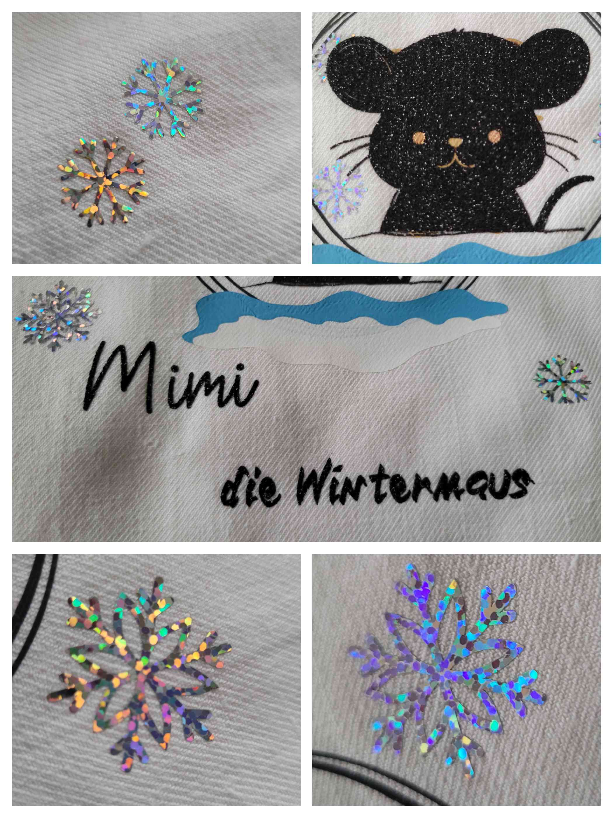 Folien für Textilien – die schwarze war eine Flockfolie, die Schneeflocken aus Stahl´s Effektfolie (Kreativmanufaktur.bayern), der Schnee Heat Transfer Folien in hellblau und weiß