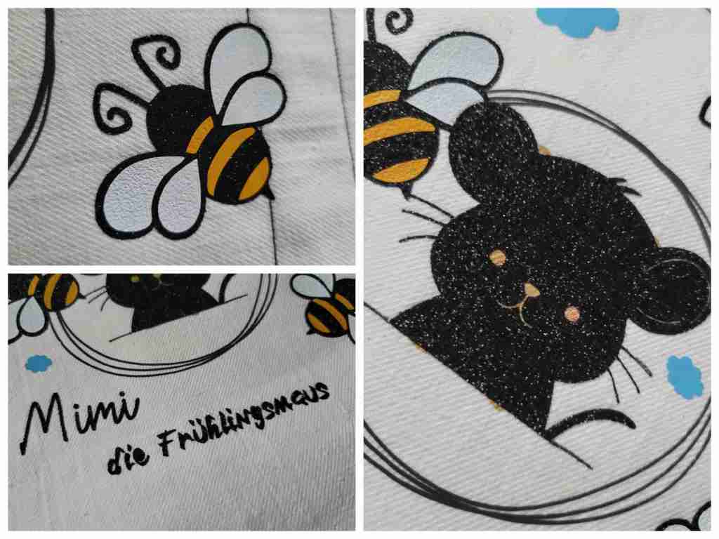 Folien für Textilien – die schwarze war eine Flockfolie, die Bienen Heat Transfer Folien in gelb und weiß, und für die Wolken eine in hellblau
