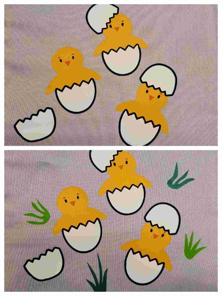 Dieses Säckchen habe ich in Schichten beplottet, da ich allein für die Küken einige Farben benutzt habe: gelb, orange, weiß und zwei mal schwarz.
